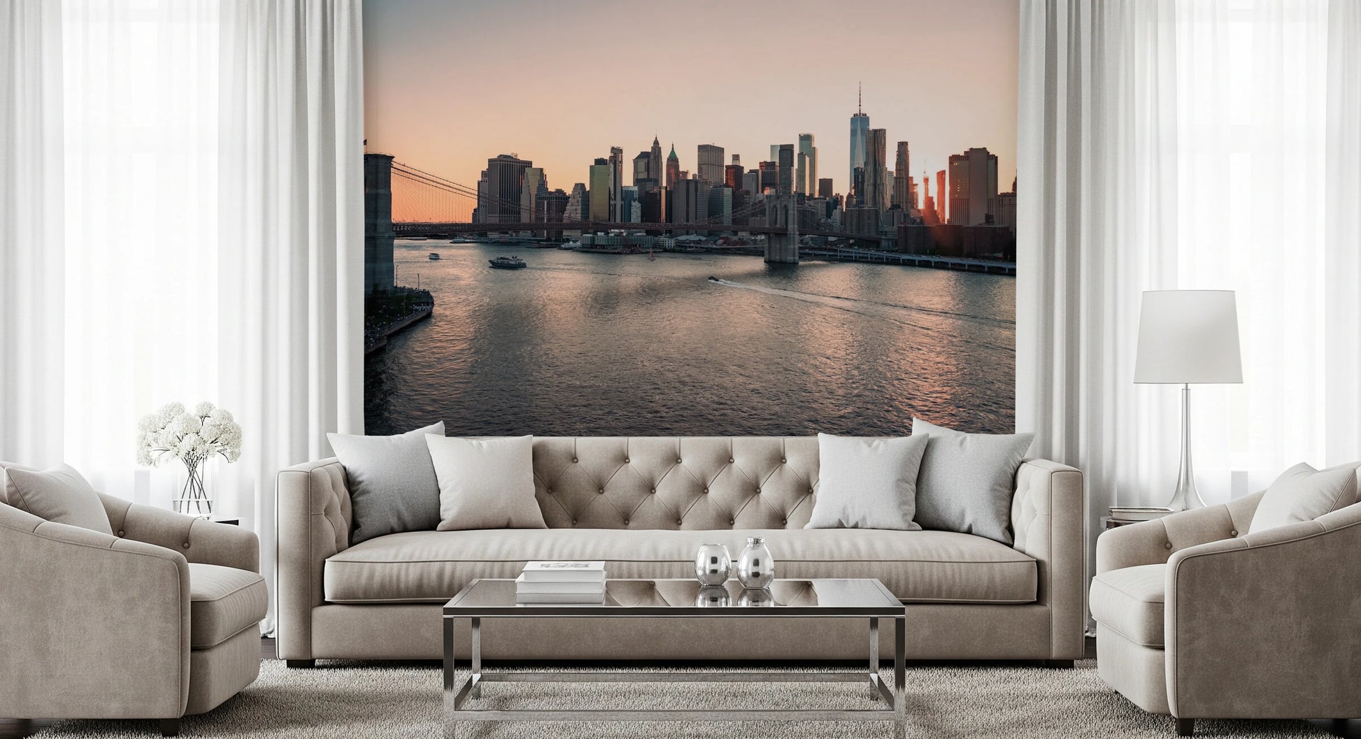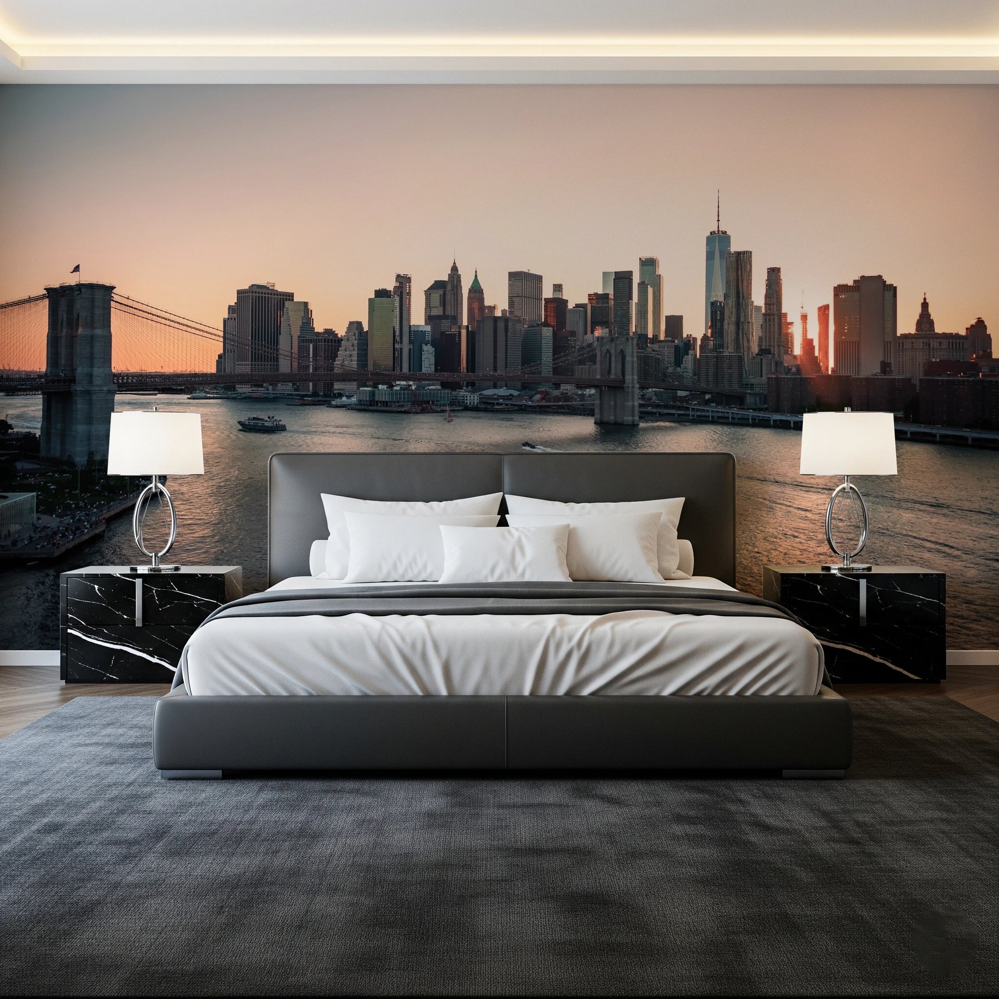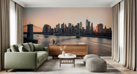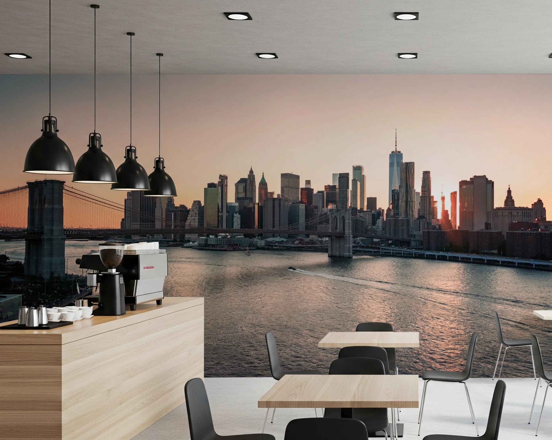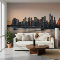 Transform your space with the captivating allure of Manhattan's cityscape as the sun rises. This wallpaper for walls showcases the iconic skyline and the elegant Brooklyn Bridge. The interplay of pastel hues and the architectural greys creates a serene yet striking ambiance. This design works beautifully in a living room, dining room, or entryway, providing a touch of urban sophistication and a sense of vibrant city life. The gentle morning light brings a touch of warmth and radiance to any room.
