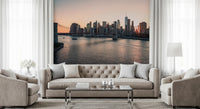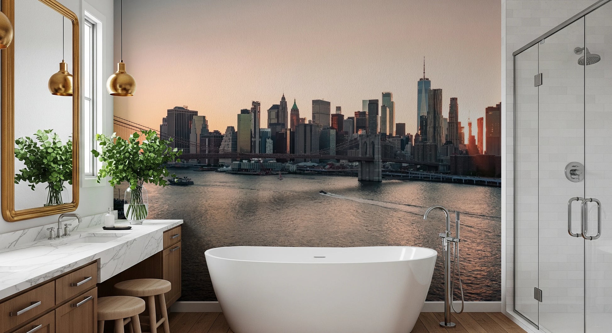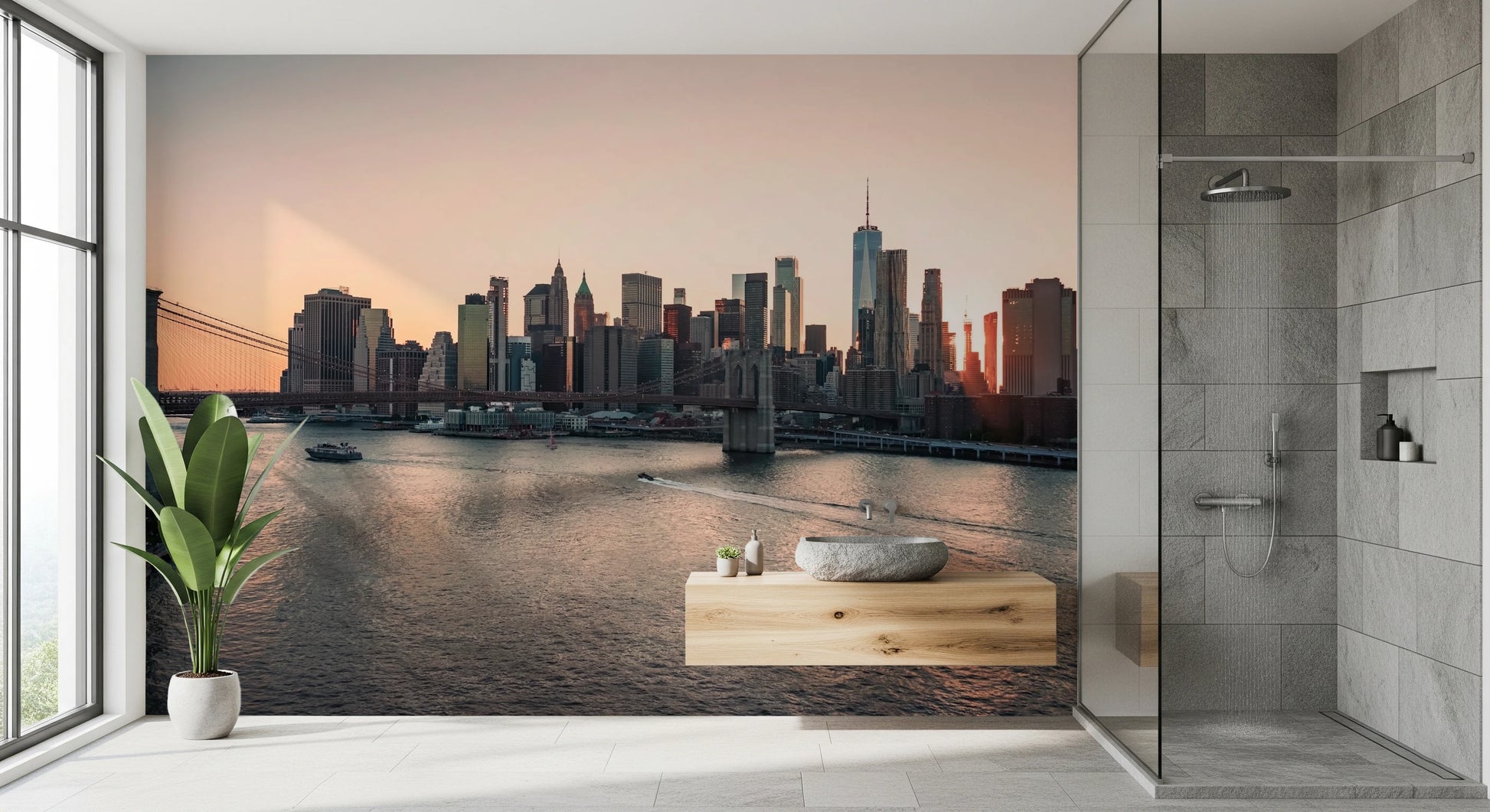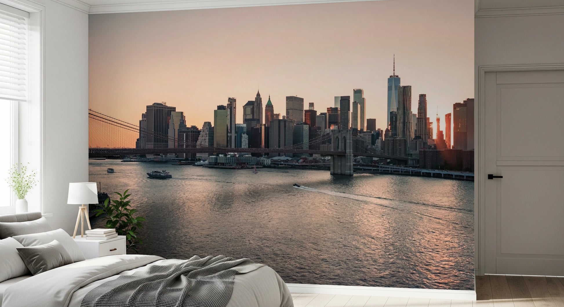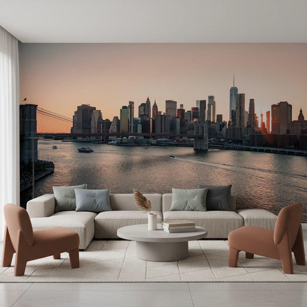 Transform your space with the captivating allure of Manhattan's cityscape as the sun rises. This wallpaper for walls showcases the iconic skyline and the elegant Brooklyn Bridge. The interplay of pastel hues and the architectural greys creates a serene yet striking ambiance. This design works beautifully in a living room, dining room, or entryway, providing a touch of urban sophistication and a sense of vibrant city life. The gentle morning light brings a touch of warmth and radiance to any room.