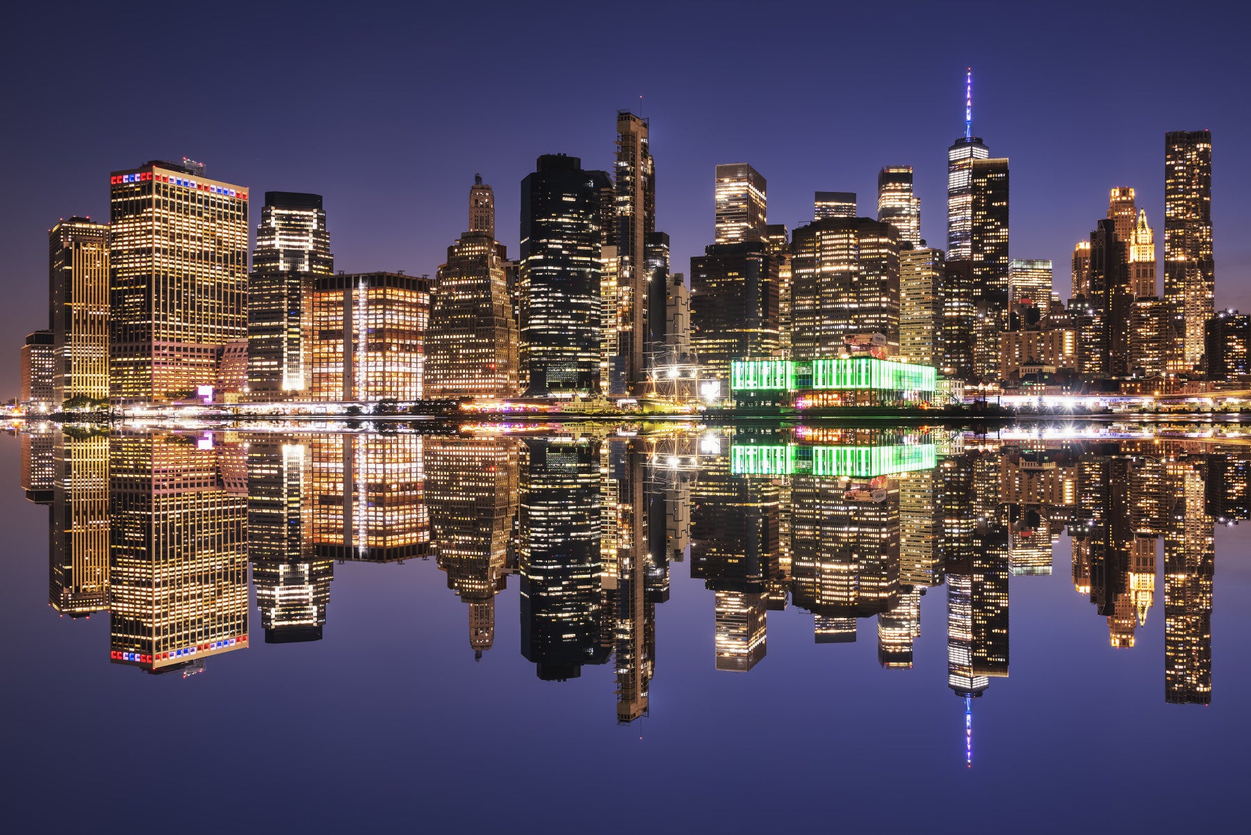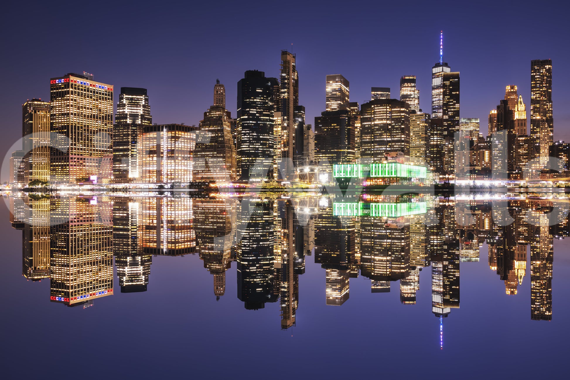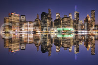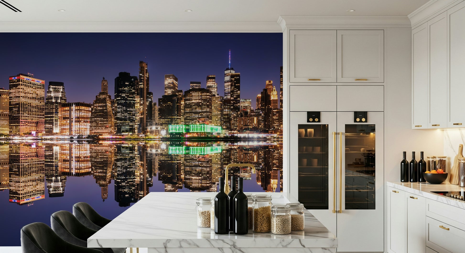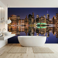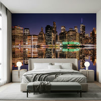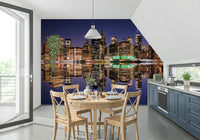Transform any room with this captivating city skyline wallpaper for walls. This design showcases a dazzling cityscape at night, with building lights shimmering against a deep blue twilight sky and reflecting beautifully on the water below. The warm tones of the illuminated buildings contrast with the cool blues, creating a dramatic and elegant backdrop. Perfect for living rooms, offices, or bedrooms, this statement piece will add depth and a sense of urban sophistication. Let this design bring the vibrant energy of the city into your home.