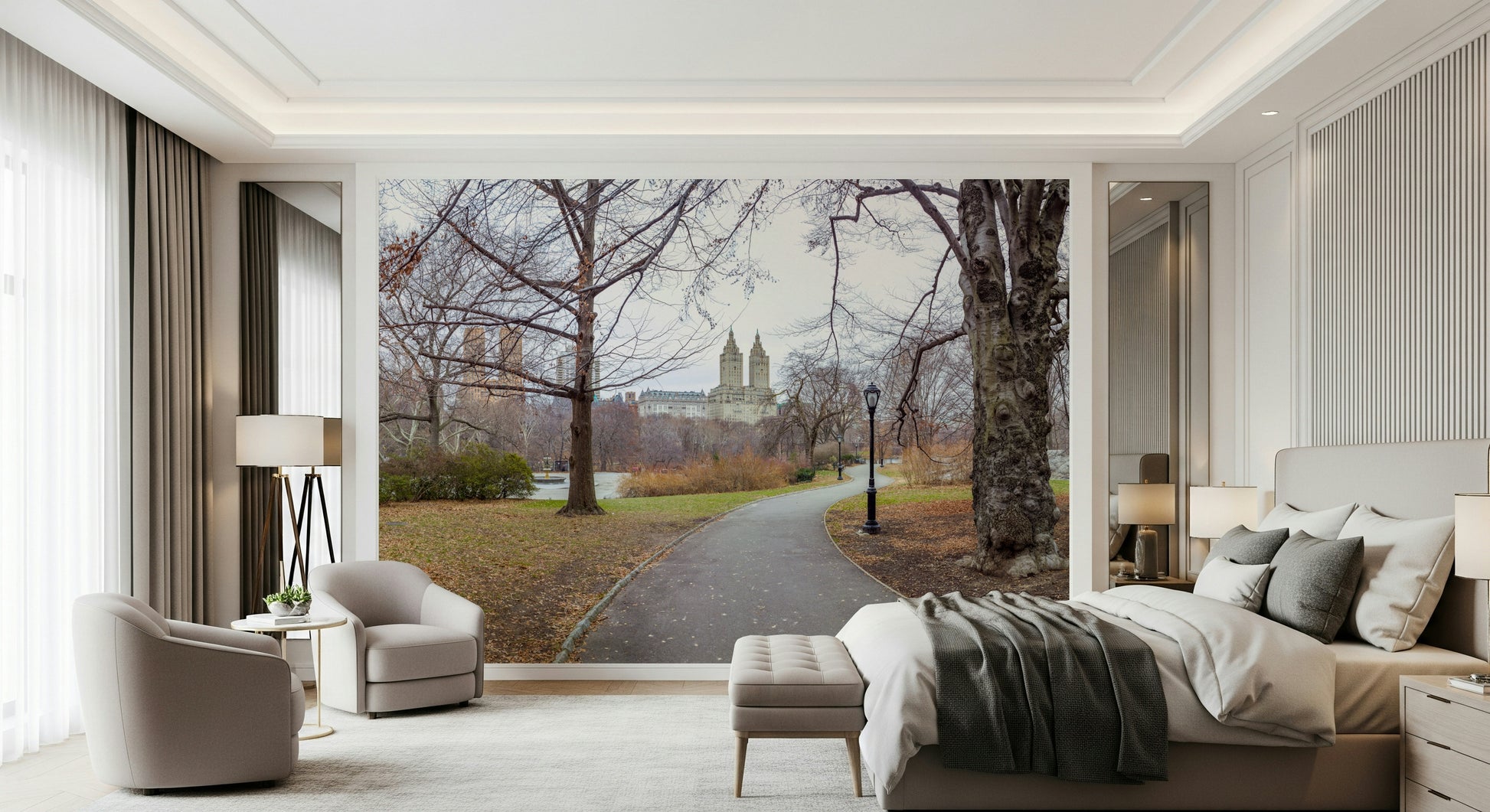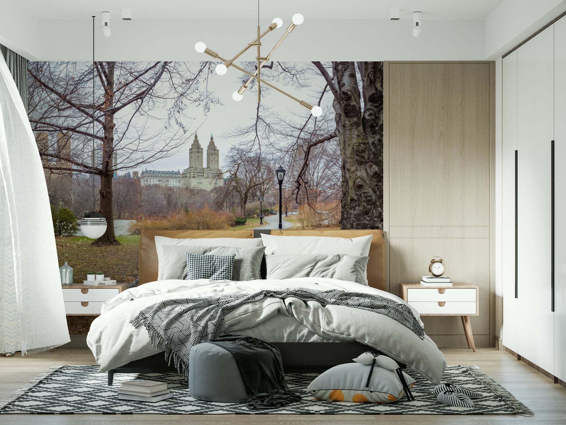 Pathway through Central park, New York. This wallpaper displays a city park framed by bare trees against an architectural backdrop. The winding path creates a sense of peace and the neutral colors soothe the eyes. This design works great as wallpaper for walls in any living space. The blend of city and nature elements allows it to complement a range of interior designs. From contemporary to classic, it brings a touch of the outdoors and adds depth to any room.