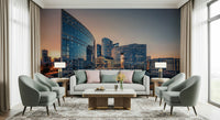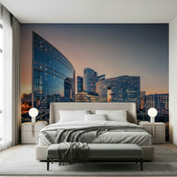 Add a touch of sophistication to your interior with this exquisite urban vista. See the interplay of light and shadow dance across modern buildings, set against a soft gradient sky. This refined wallpaper for walls will give a room a sense of depth and style. Its cool blue and warm orange palette provides a soothing and intriguing background. Ideal for spaces seeking a contemporary edge, such as home offices, living rooms, or bedrooms. This design complements streamlined furniture and modern aesthetics.