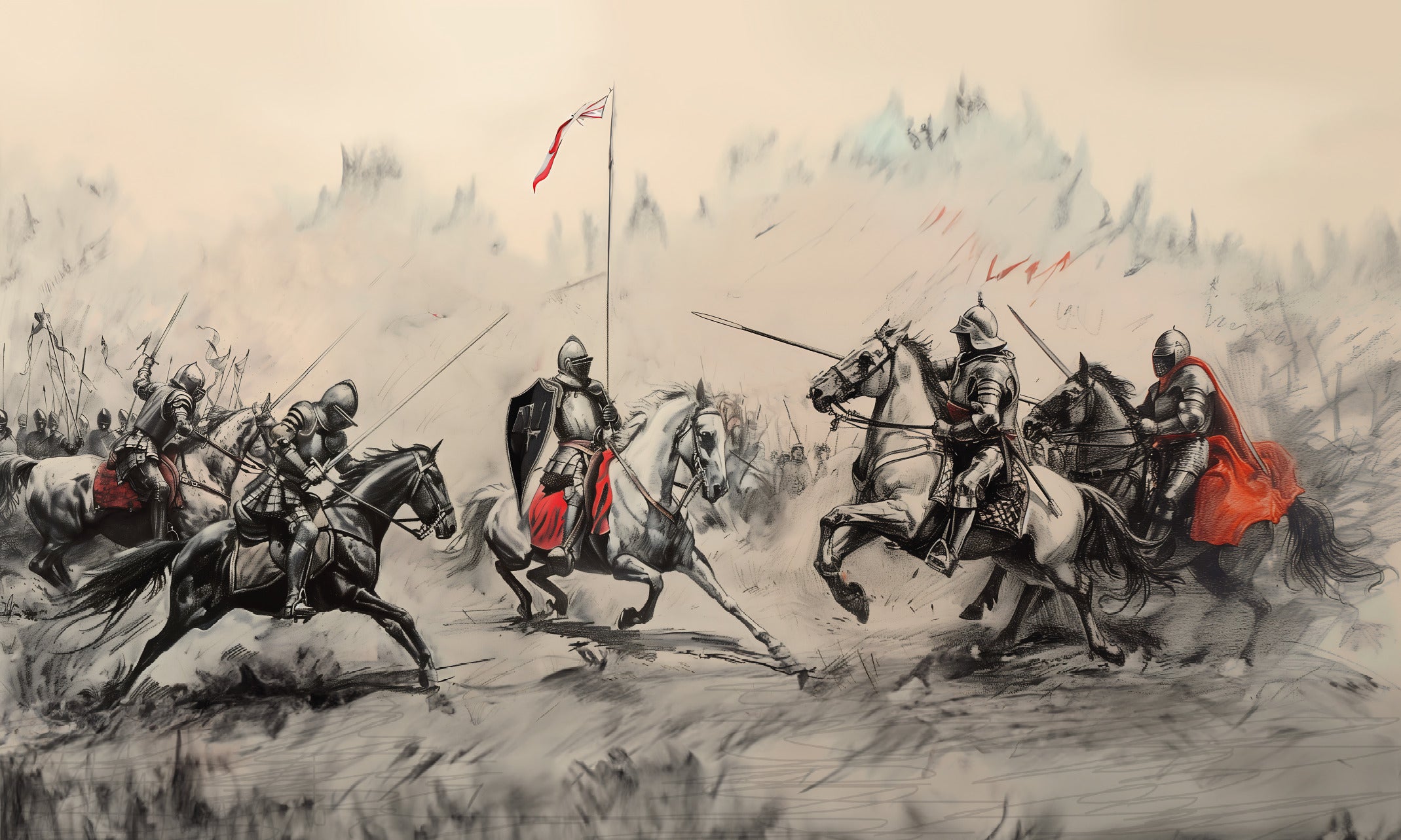 Welcome to the battleground of valor and Chivalry with Clash of Steel Medieval Wallpaper. Black and white dramatic sketches, getting into bold red highlights paintwork of muscular knights on their steeds in a fight. Medieval warfare at it's finest flags flapping, swords clashing, war horses crashing into each other in full color! For history geeks, game rooms or anyone who loves the bygone era of medieval legends this wallpaper is what you need! Step into the worlds of knights and noble quests with this amazing mural.