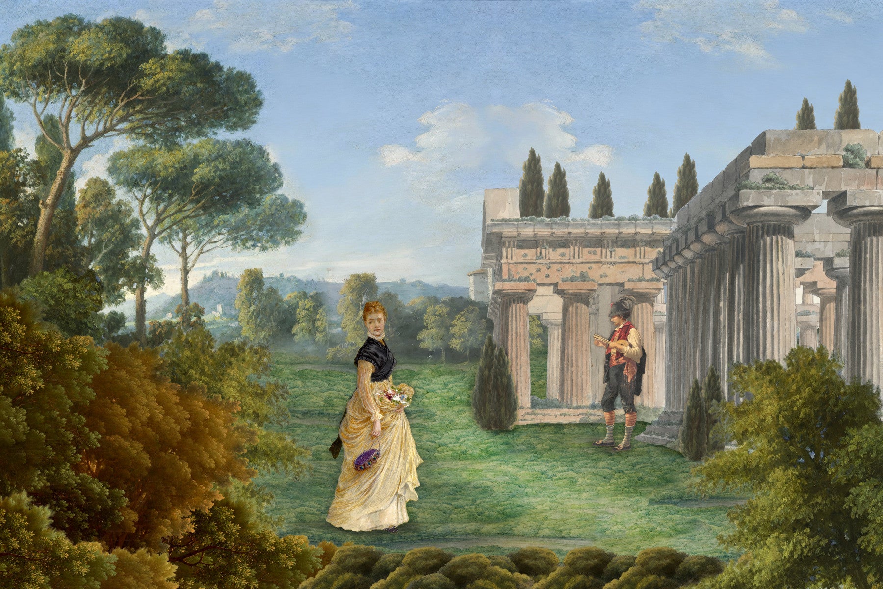This elegant wallpaper for walls transforms your space into a serene classical garden. Ancient architectural ruins frame a verdant landscape, establishing a dramatic backdrop. A gracefully dressed woman, holding delicate flowers, and a mandolin-playing man add a touch of timeless human interest to the scene. Lush greens, soft sky blues, and warm stone hues dominate the palette, creating a calming, sophisticated ambiance. This design enhances living rooms, formal dining areas, or studies, infusing historical romance and refined beauty. Its painterly style brings enduring charm, crafting an immersive backdrop for relaxation and contemplation.