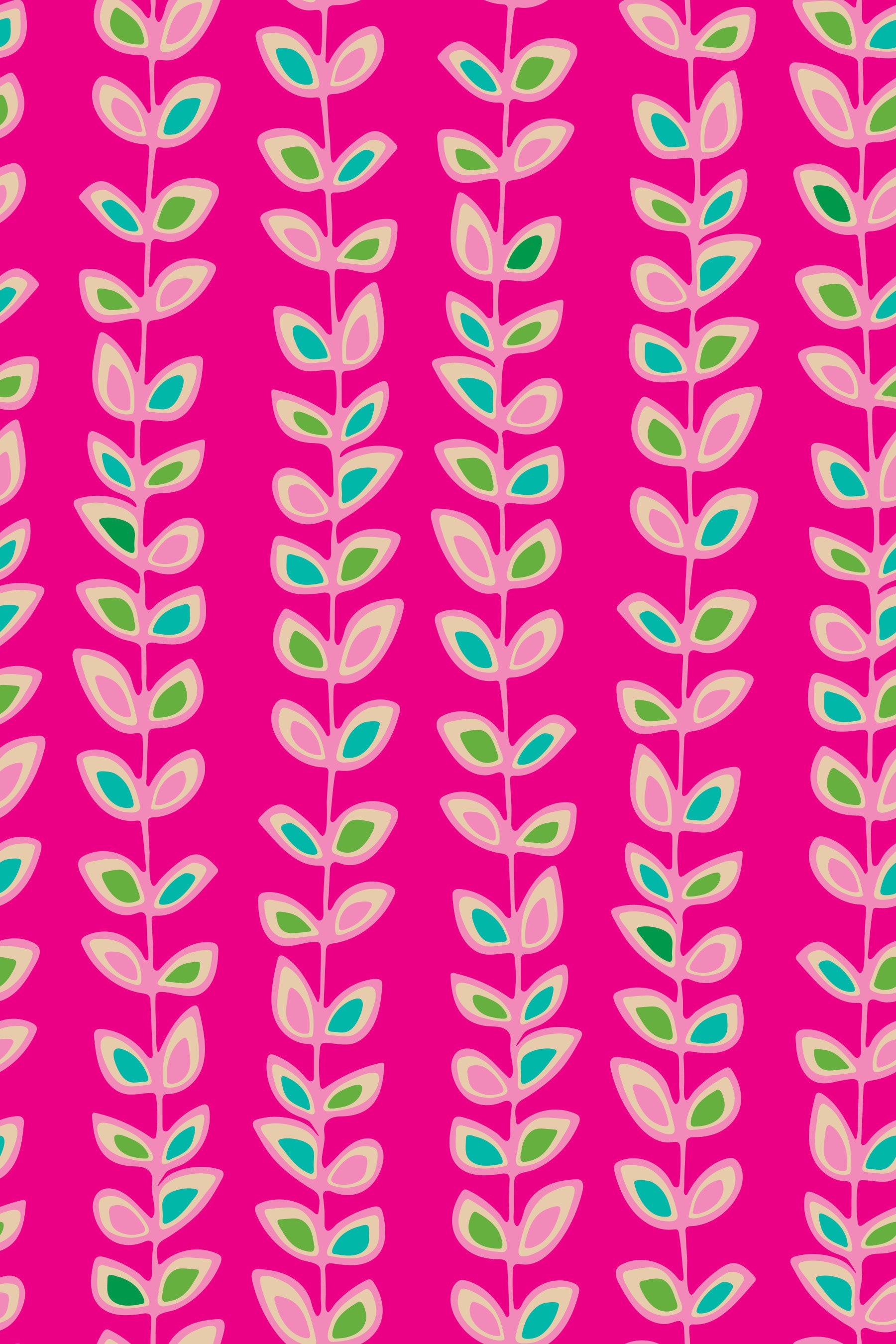 Retro bohemian and playful hand-drawn climbing vines create fun leafy botanical stripes! In a gorgeous charming vibrant colourway of Pink, Green, Turquoise and Cream on feminine Fuchsia! This pattern design is also available in Other Colourways too. Original wallpaper pattern design by Jackie Tahara of UnBlink Studio.