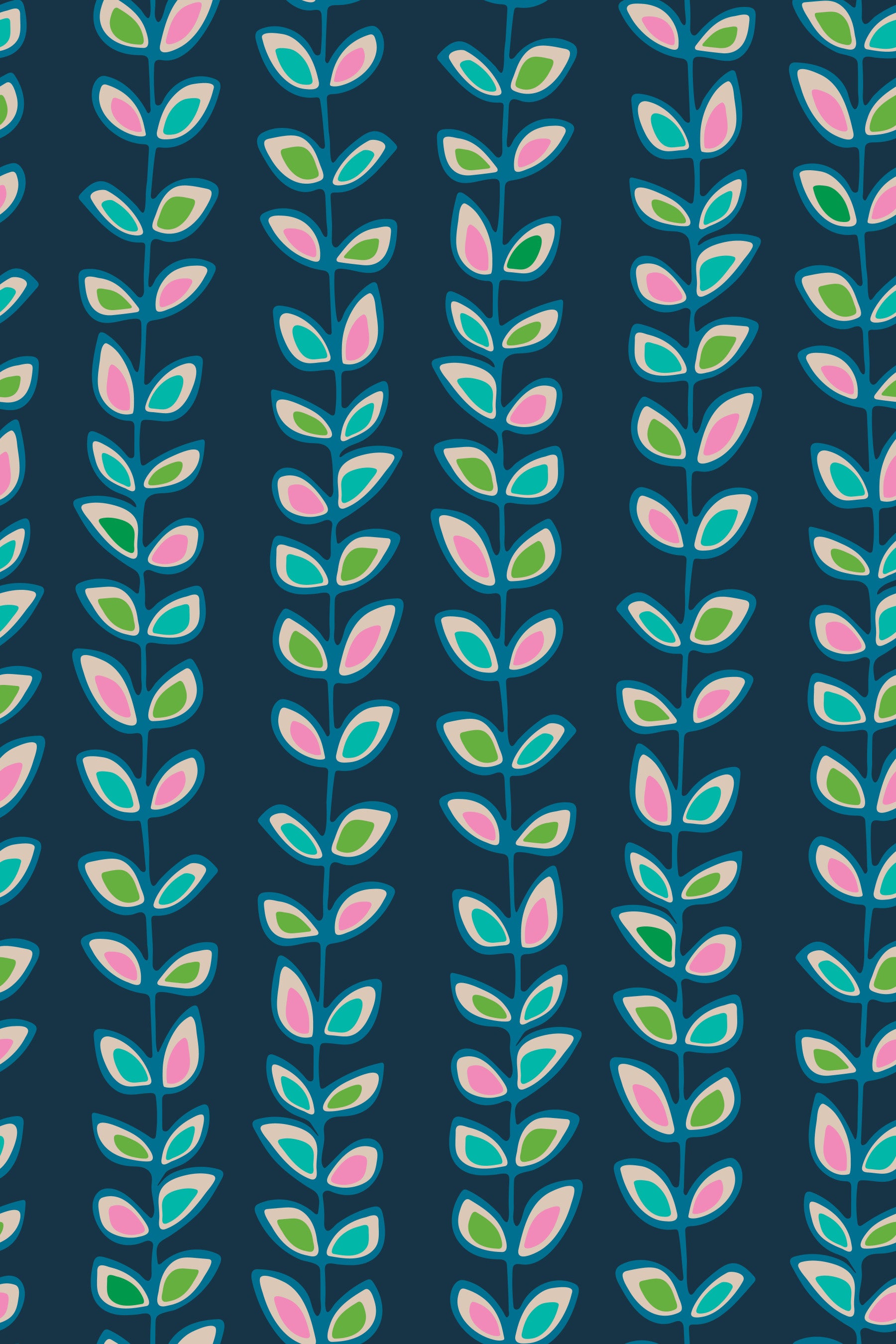 Retro bohemian and playful hand-drawn climbing vines create fun leafy botanical stripes! In a gorgeous charming vibrant colourway of Pink, Green, Turquoise and Cream on dark Navy Blue! This pattern design is also available in Other Colourways too. Original wallpaper pattern design by Jackie Tahara of UnBlink Studio.