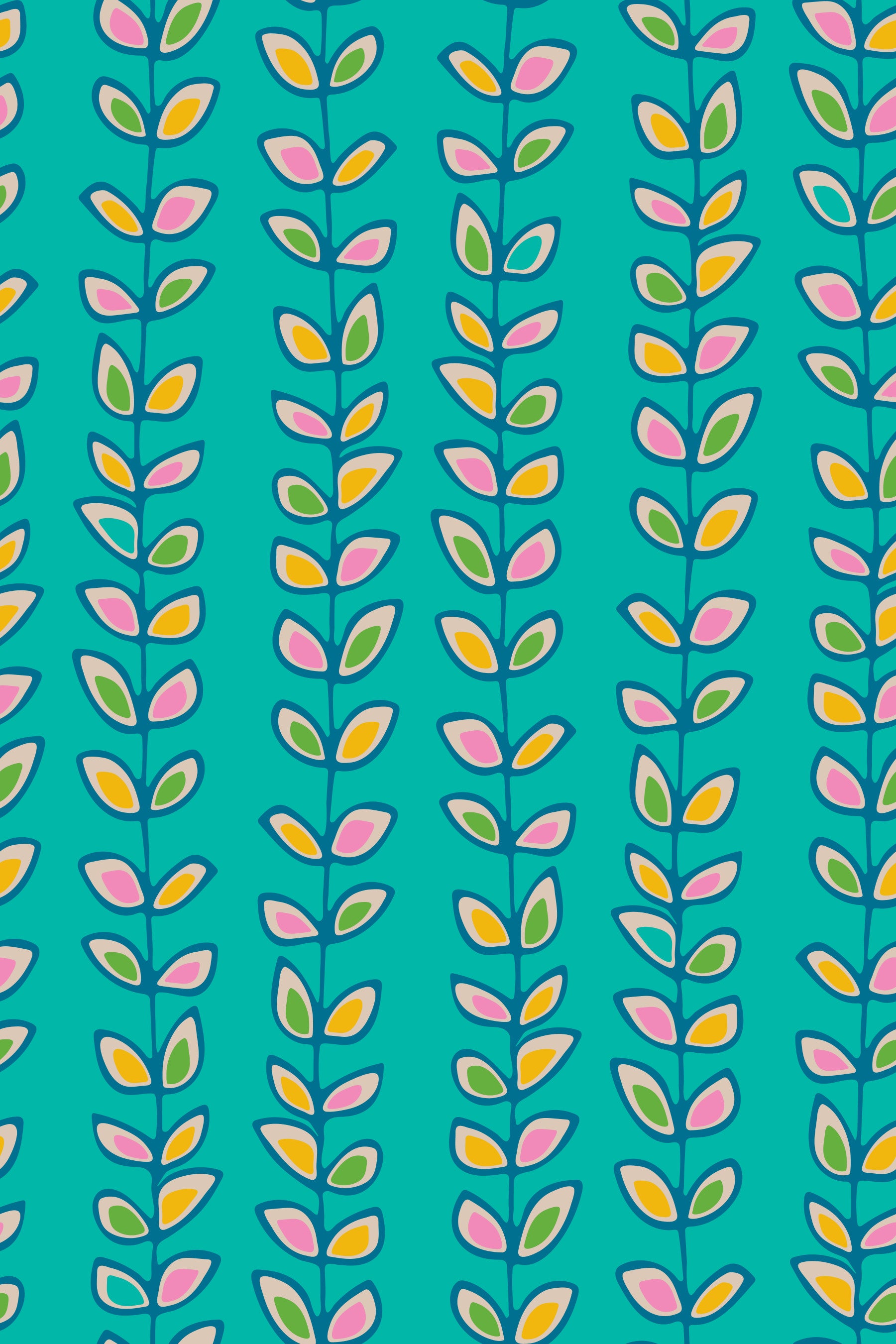 Retro bohemian and playful hand-drawn climbing vines create fun leafy botanical stripes! In a gorgeous charming cottagecore colourway of bright Pink, Green, Yellow and Cream on Turquoise. This pattern design is also available in Other Colourways too. Original wallpaper pattern design by Jackie Tahara of UnBlink Studio.