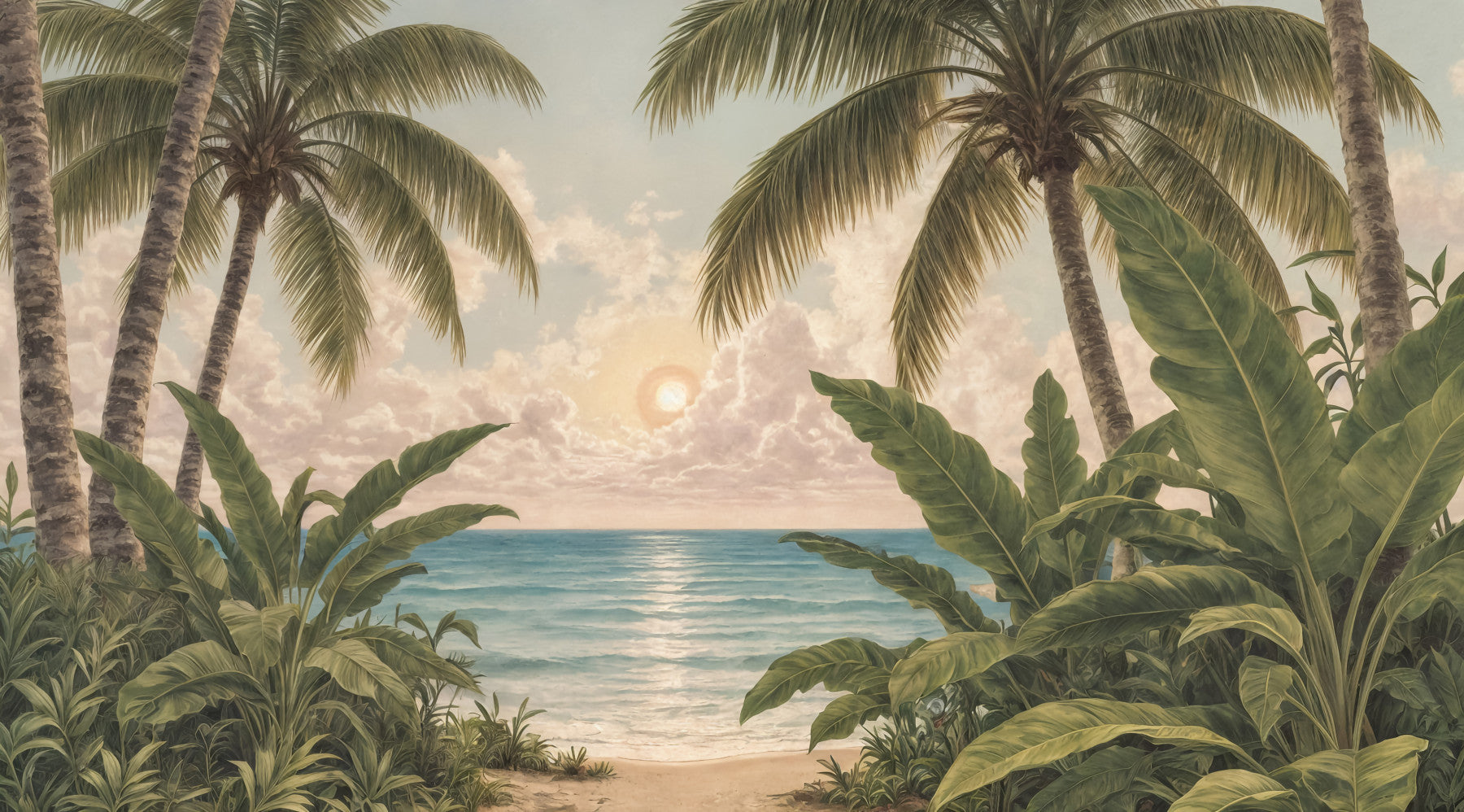 Bring the peace of a tropical getaway into your home with this stunning wallpaper. The design features lush palm trees and broad leaves, framing a serene ocean view at sunset. Soft hues of green, beige, and blue create a calming atmosphere. Ideal for bedrooms, living rooms, or any space where you want to feel relaxed, this wallpaper for walls will transform your interior into a tranquil paradise. The gentle color palette allows it to easily blend with various decor styles.