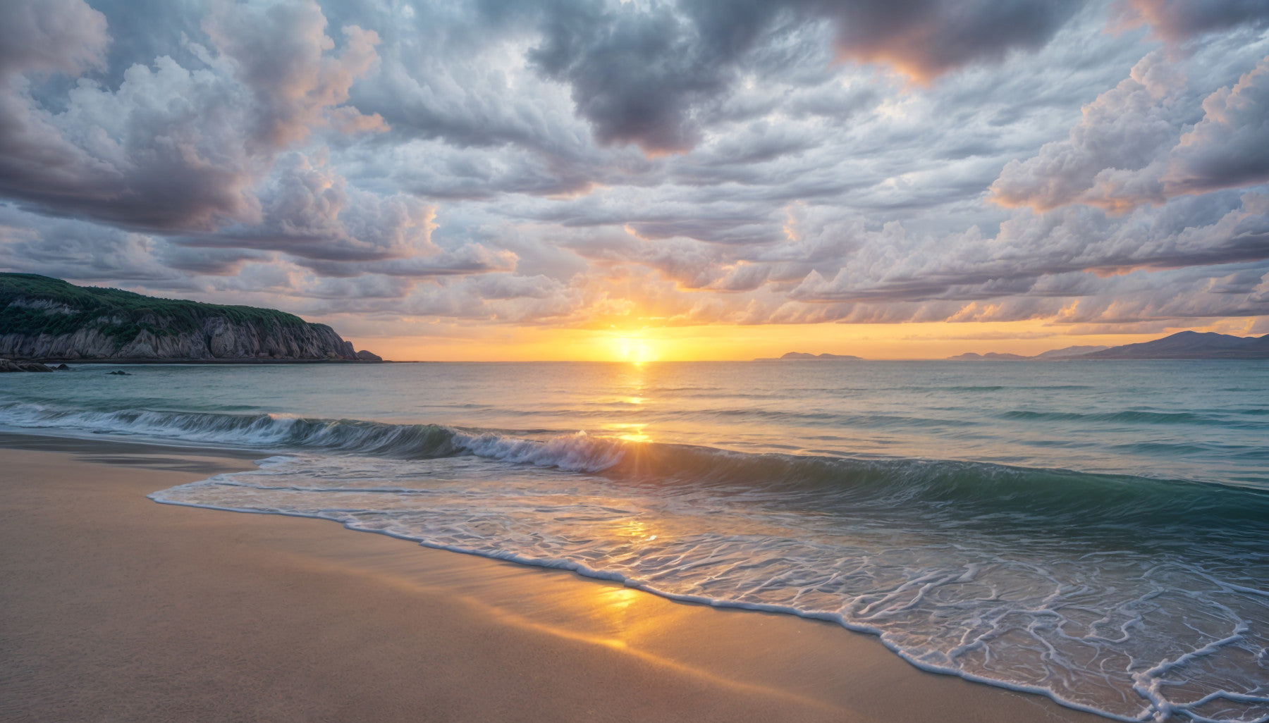 Bring the calming effect of the ocean into your home with this serene coastal sunrise wallpaper. The soft hues of gold, blue, and beige create a tranquil atmosphere. Waves gently lap against the shore under a dramatic sky. This wallpaper for walls works beautifully in a bedroom, living room, or bathroom. The serene landscape design complements modern, minimalist, or coastal interiors, making the space feel open and airy. Enjoy the beauty of nature every day.