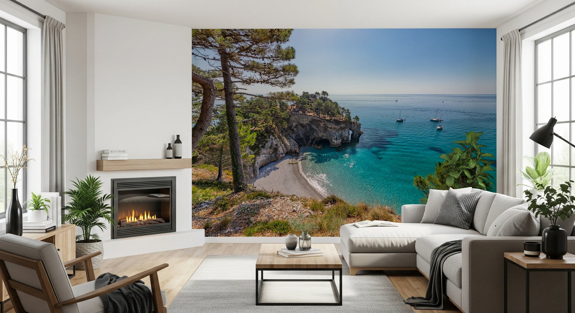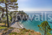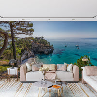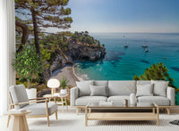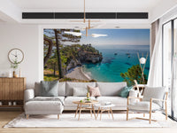 Bring a serene coastal escape into your home with this captivating wallpaper for walls. The design showcases a breathtaking view of a secluded beach with turquoise waters meeting a dramatic cliffside. Sunlight dances across the water, creating a luminous and inviting ambiance. Gentle blues and greens blend harmoniously, complemented by the earthy tones of the trees and shoreline. Ideal for a living room, bedroom, or office, this wallpaper enhances spaces with a sense of calm and natural beauty. It functions as a statement piece, making it a perfect accent wall.