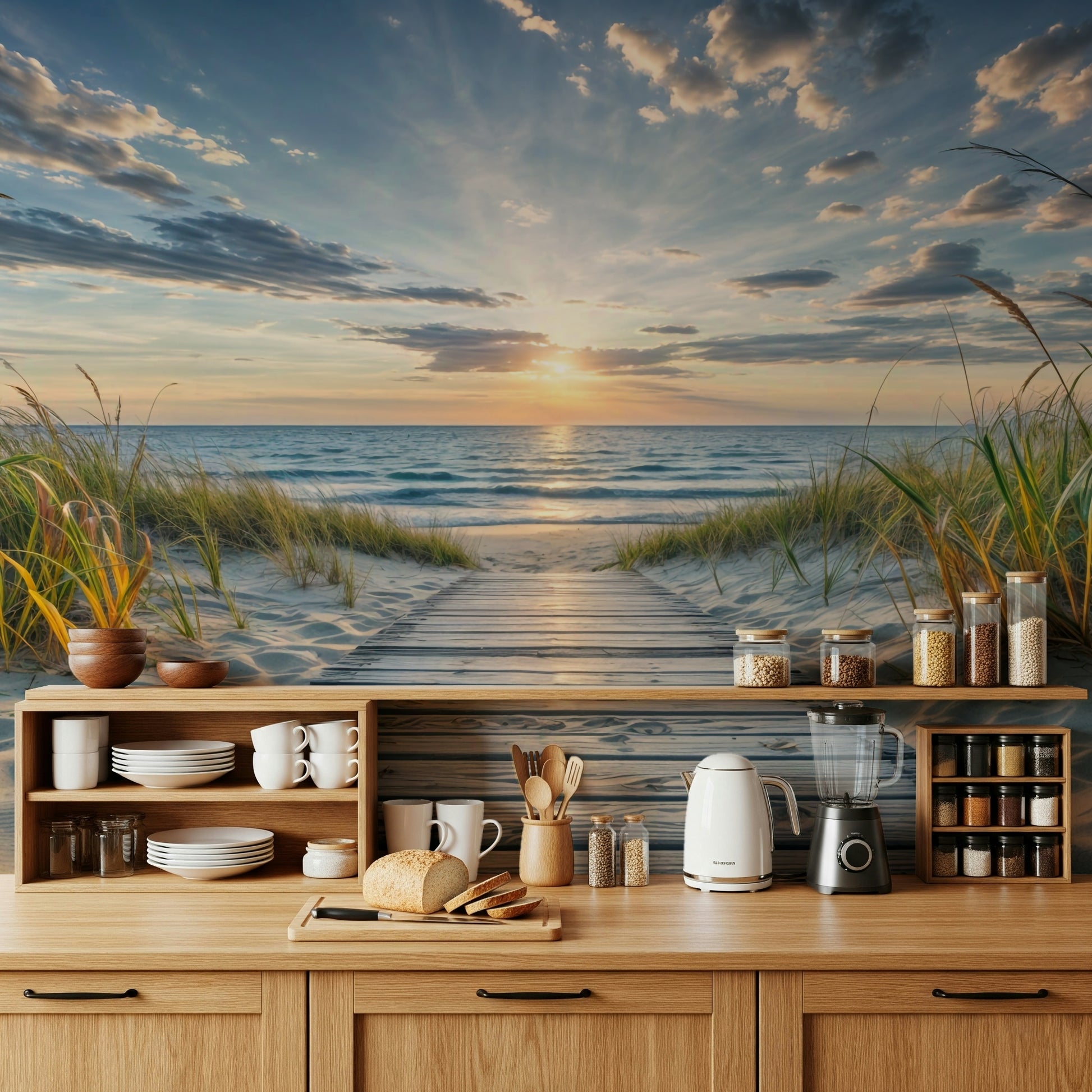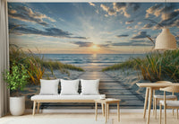 Bring the tranquility of the seaside into your home with this beautiful wallpaper for walls. A wooden boardwalk leads to a serene beach, bathed in the soft hues of a setting sun. Gentle waves meet the shore under a sky streaked with calming blues and oranges. The natural tones of the sand and sea grass create a soothing, organic feel. This design works wonderfully in bedrooms, bathrooms, or any space where you want to cultivate a relaxed, coastal vibe. Elevate your interior with this peaceful vista.