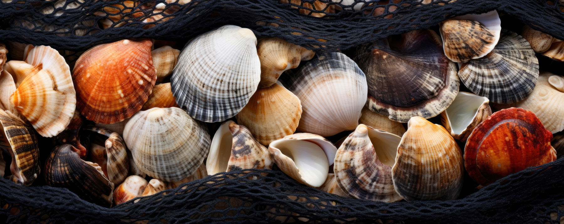 Dive into the serene beauty of the ocean with "Coastal Treasures." This captivating wallpaper showcases a collection of exquisite seashells, carefully gathered and elegantly arranged. The intricate patterns and warm, earthy tones of the shells evoke a sense of tranquility and natural wonder. Drapped across the shells is a rustic black fishing net, adding a touch of seafaring charm and texture to the composition. Each shell tells a silent story of the sea, its unique form and color shaped by the ebb and flow of tides. This wallpaper brings a touch of the coast's timeless elegance to your digital space, offering a calming and visually stimulating experience that celebrates the simple yet stunning treasures found along the shoreline. It's a perfect way to bring the ocean's harmony and artistry into your everyday life.