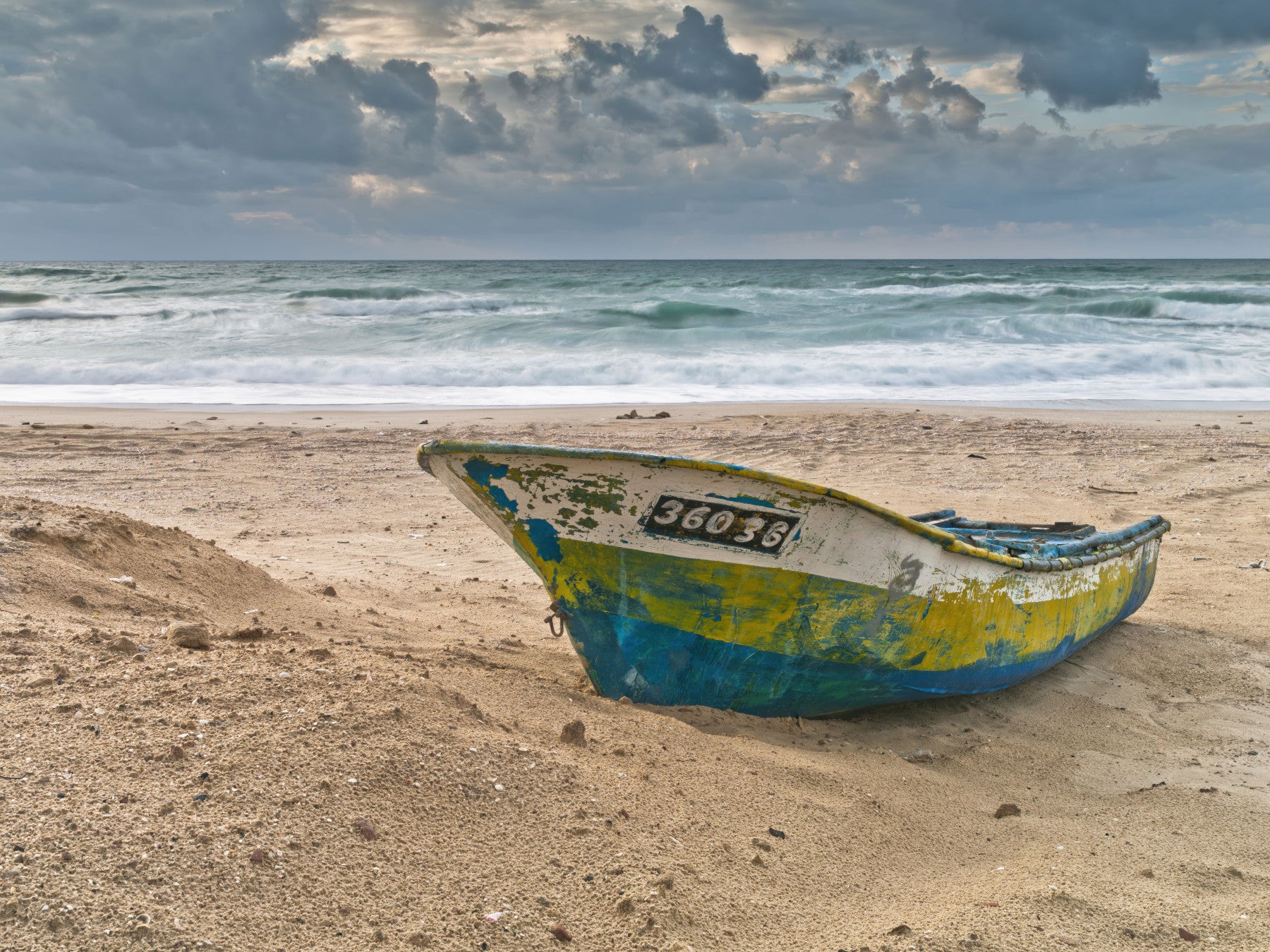 Fishing Boat on the shore, Palmachim Beach, Israel. This coastal wallpaper for walls brings the quiet strength of the sea into your home. This design features a worn boat on a sandy beach, with soft waves and a peaceful sky in the background. Shades of blue and yellow offer a nautical feel, adding calmness to any room. Perfect for living rooms, bathrooms, or bedrooms, this wallpaper complements interiors with a subtle beachy vibe, infusing them with a serene and inviting atmosphere. Set sail for style.