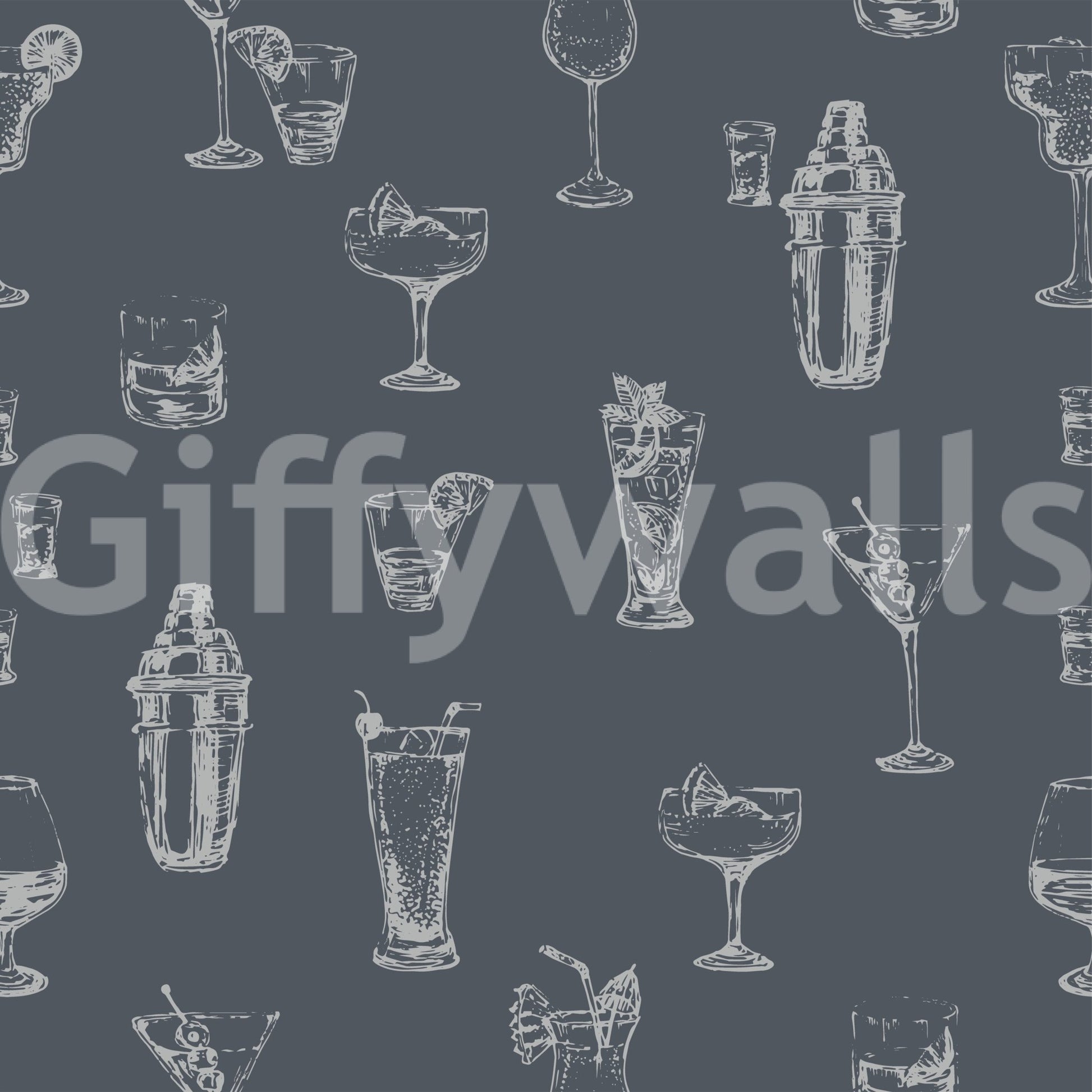 This sophisticated wallpaper features a charming hand-drawn illustration of various cocktails and bar tools. The repeating pattern of glasses, shakers, and garnishes creates a stylish and elegant ambiance. The muted silver-grey on a dark grey background offers a timeless feel, perfect for a bar, home office, or any space that appreciates a touch of classic sophistication. The intricate details of each drink add visual interest, and the overall design is effortlessly chic, perfect for adding a unique and tasteful accent to your walls.