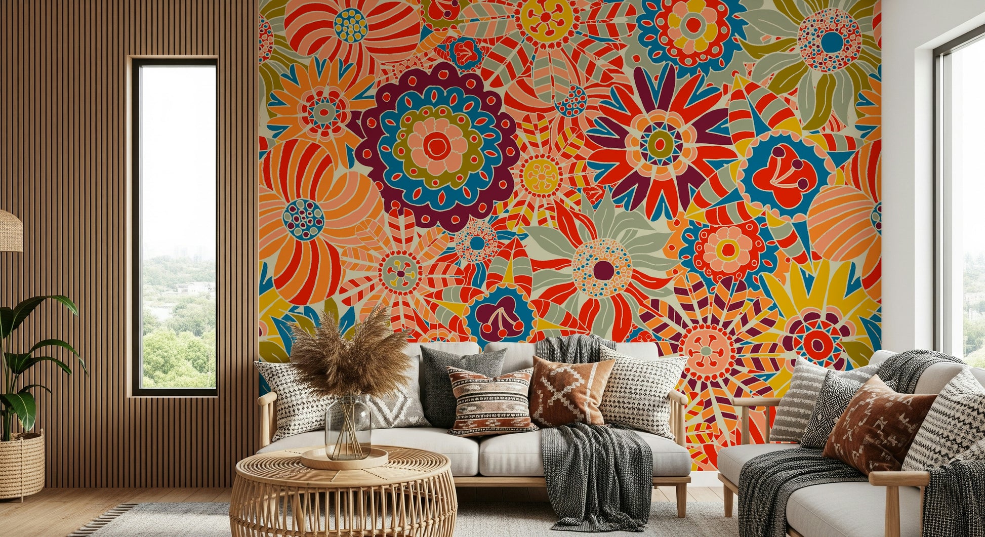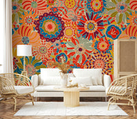 Step back into the vibrant vibes of the 70s with this groovy floral wallpaper. A medley of stylized flowers in shades of orange, blue, yellow and burgundy blooms across the surface, creating a joyful and energetic feel. This design features bold outlines and a seamless repeat, ensuring an impactful statement on any wall. Use this wallpaper for walls in your living room, bedroom or dining area to add a playful retro accent. This wallpaper is perfect for creating cozy and colorful interiors.