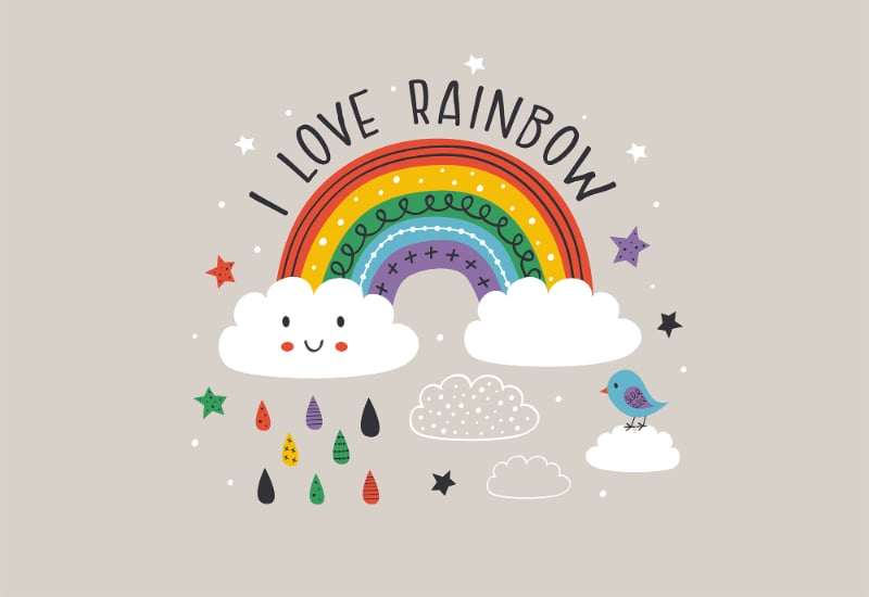 This whimsical and cheerful mural shows a smiling cloud in the background with a colorful rainbow in the foreground, guaranteed to cheer up just any room. Raindrops are mischievous and play around brightly, while a little blue bird creates a fantasy. The approachable sky and gentle stars make an amiable ambiance and are suitable for a child's room or playroom. With its bright colors and easy, clean aesthetic, this rainbow wallpaper can brighten a room and add a touch of cheer and welcome to it. It's a charming way to bring color and a dash of fantasy to the wall.