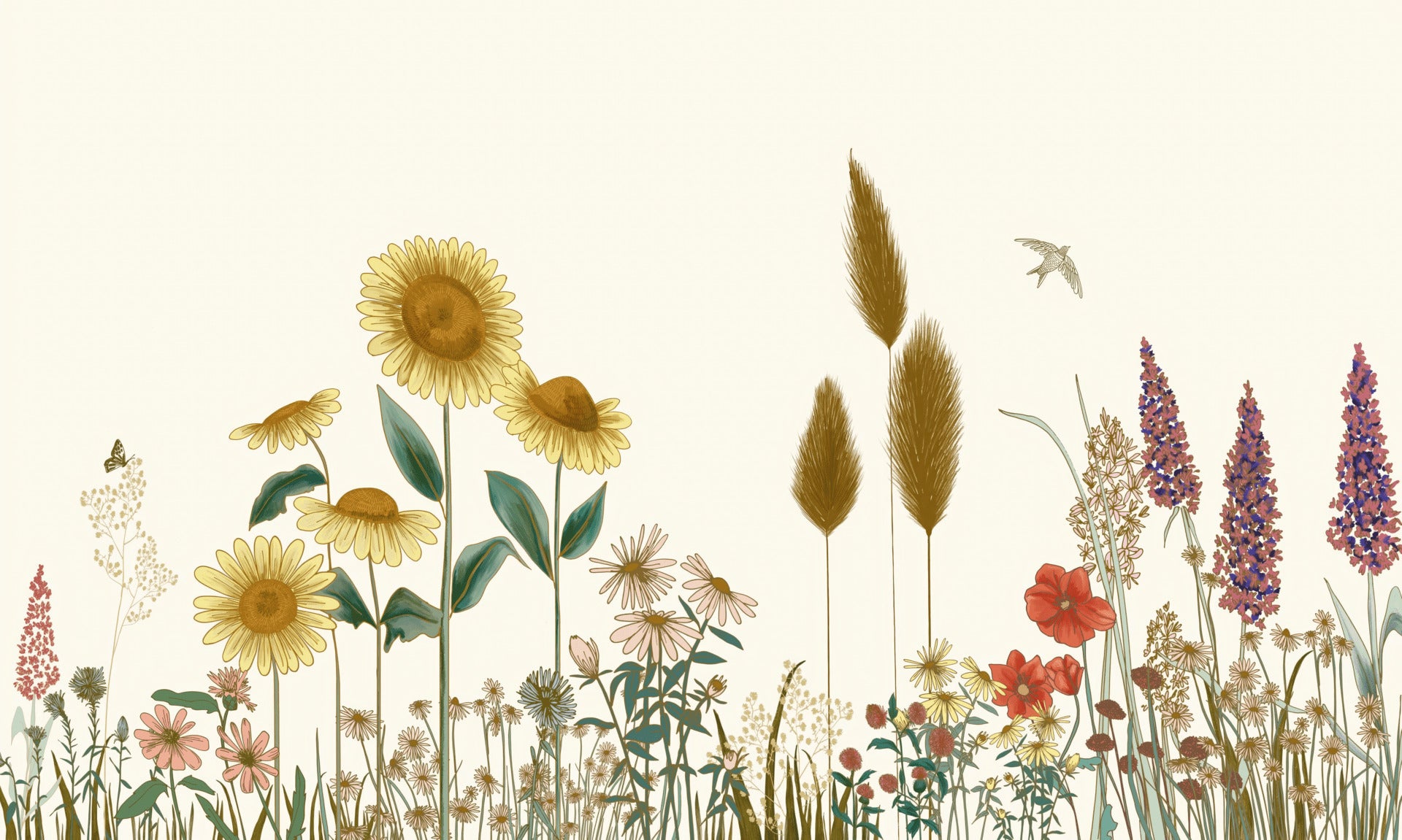 This colourful flower mural, a lavish botanical wallpaper, brings the charm of a lush meadow to your walls. Witness a festival of flora: sunflowers reaching for the sky and wild grasses whispering secrets to the wind. A canvas of nature's finest works invites hummingbirds in mid-hover, with their wings etched against a pastel sky. Each petal and leaf is drawn with utmost detail, a feast for the eyes that depicts the wild, free spirit of a blooming field. This wallpaper is a haven for those who yearn for a burst of life and colour in their retreat. Adorn your walls with this piece, and let the vivid beauty of nature's bouquet flourish indoors.