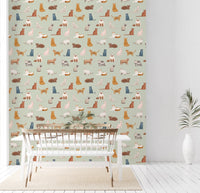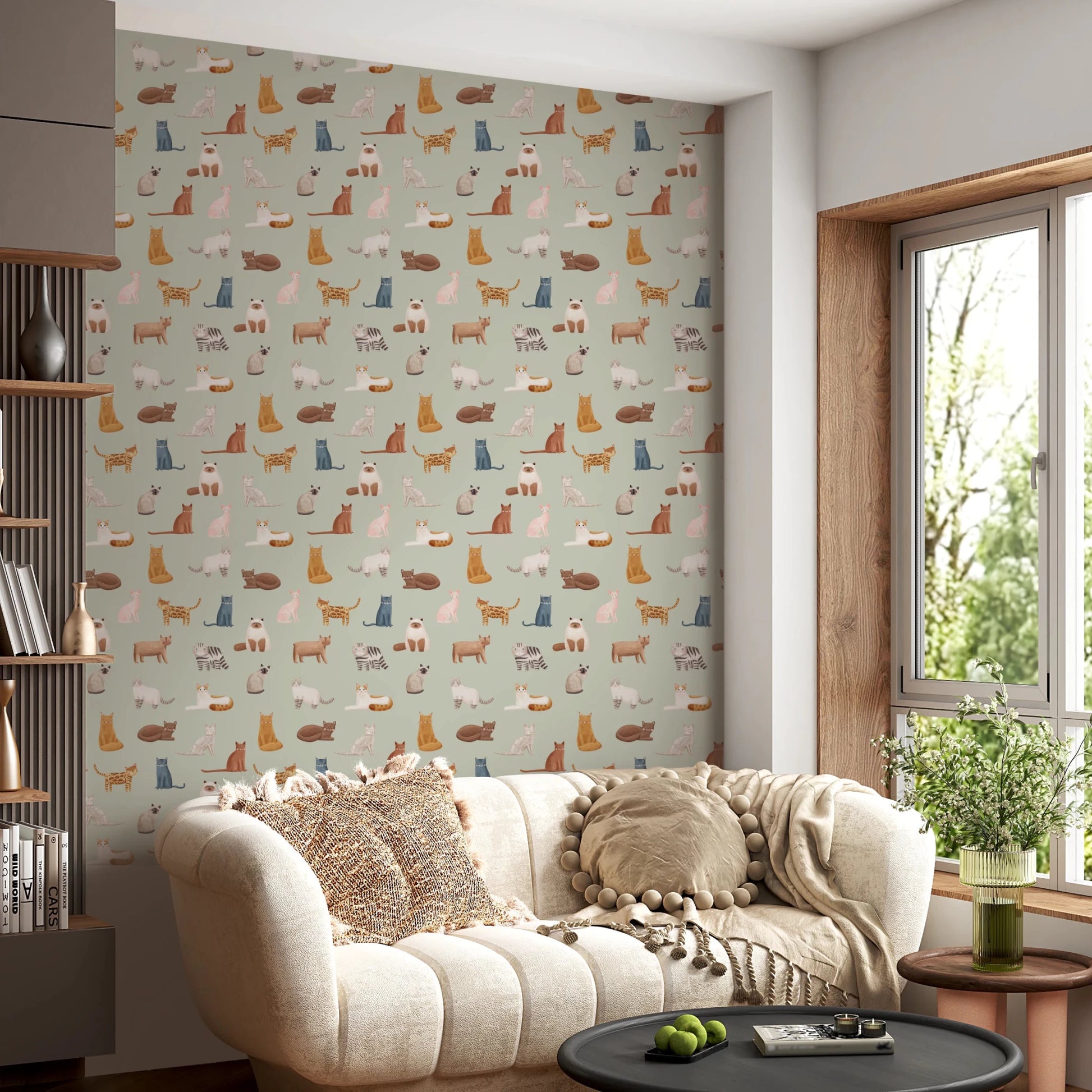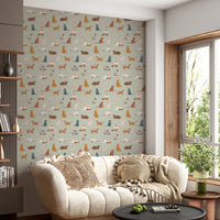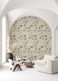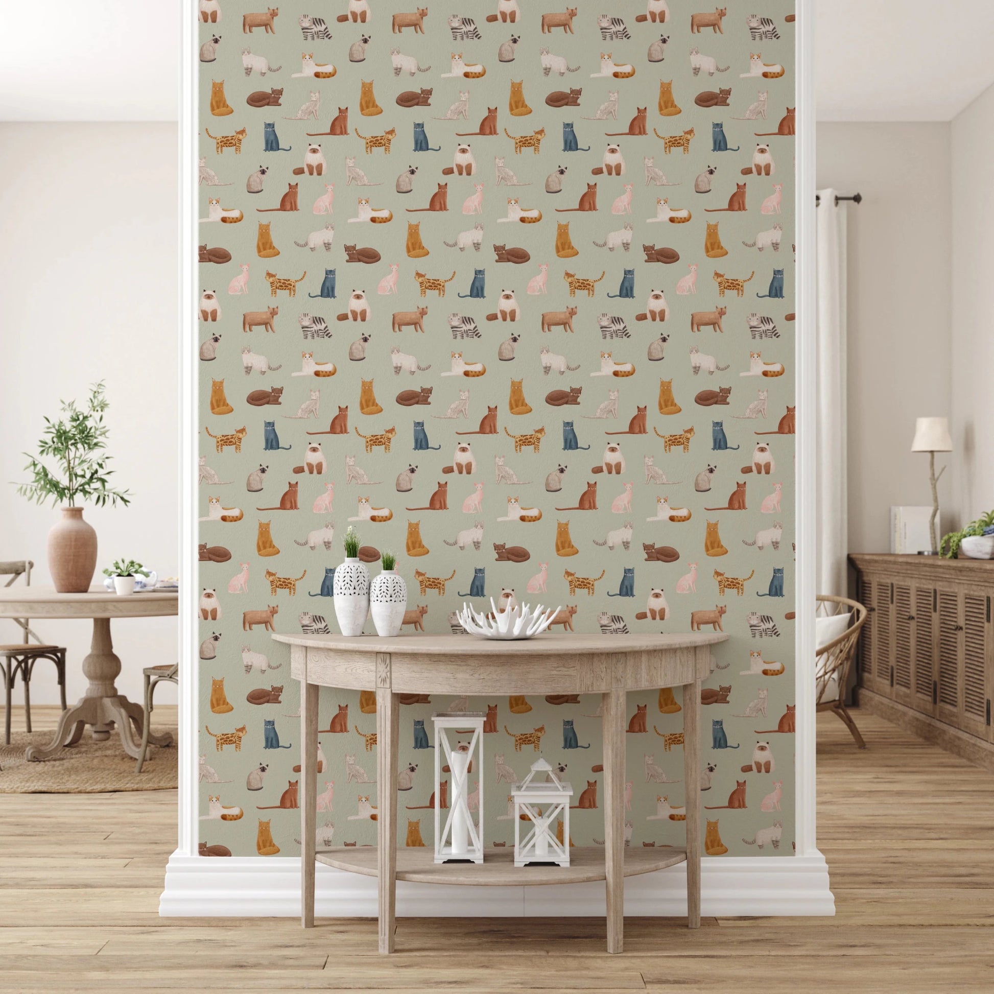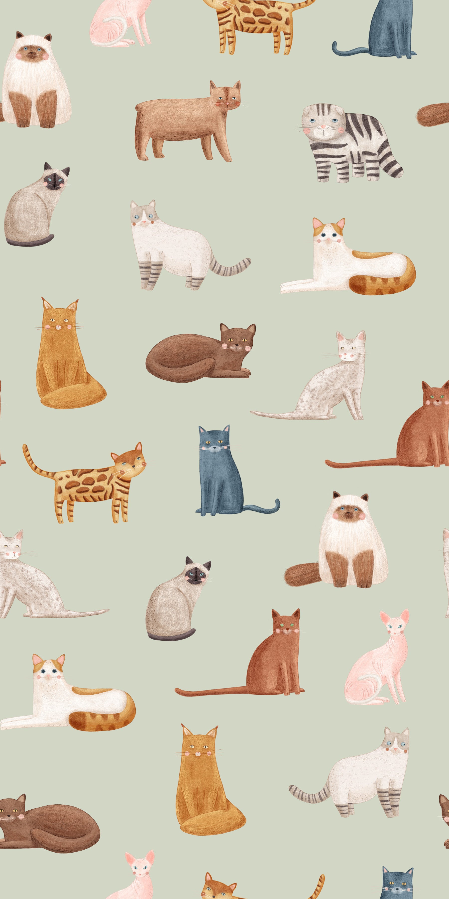 Transform your walls with this playful cat-themed wallpaper. The design features an assortment of charming feline illustrations in a variety of breeds and poses. Warm browns, cool blues, soft pinks, and shades of white contrast beautifully against a gentle green backdrop. This versatile color palette complements various interior styles. Install this wallpaper for walls in a kid's bedroom or playroom. It adds a touch of whimsy to living rooms, hallways, and even bathrooms. The detailed cat drawings bring personality and visual interest to any space, creating an inviting atmosphere.