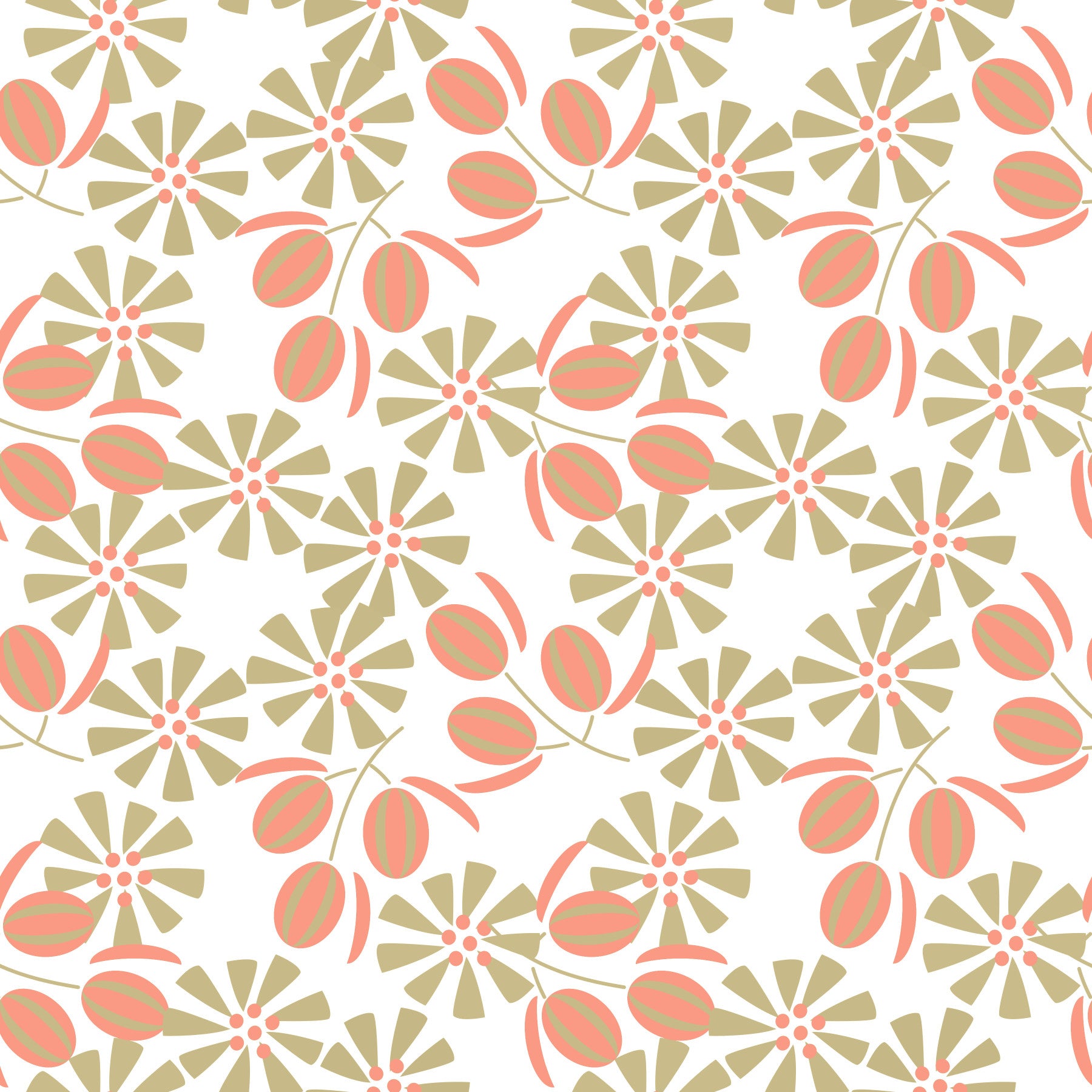 Embrace the refreshing beauty of 'Coral Blossom Time,' a wallpaper that captures the essence of springtime tranquility. This elegant design features stylized floral motifs in a sophisticated palette of coral and muted gold, set against a clean white backdrop. The blossoms, reminiscent of delicate anemones, are interspersed with coral-toned seedpods or buds, creating a harmonious balance between floral exuberance and understated charm. The repeating pattern offers a visually calming effect, ideal for creating a serene atmosphere in any room. Imagine this wallpaper adorning a bedroom, study, or living area, adding a touch of refined natural beauty to your everyday surroundings. 'Coral Blossom Time' evokes a sense of renewal and gentle warmth, transforming your space into a haven of peaceful elegance. Let this wallpaper blossom into a stunning backdrop for your life.