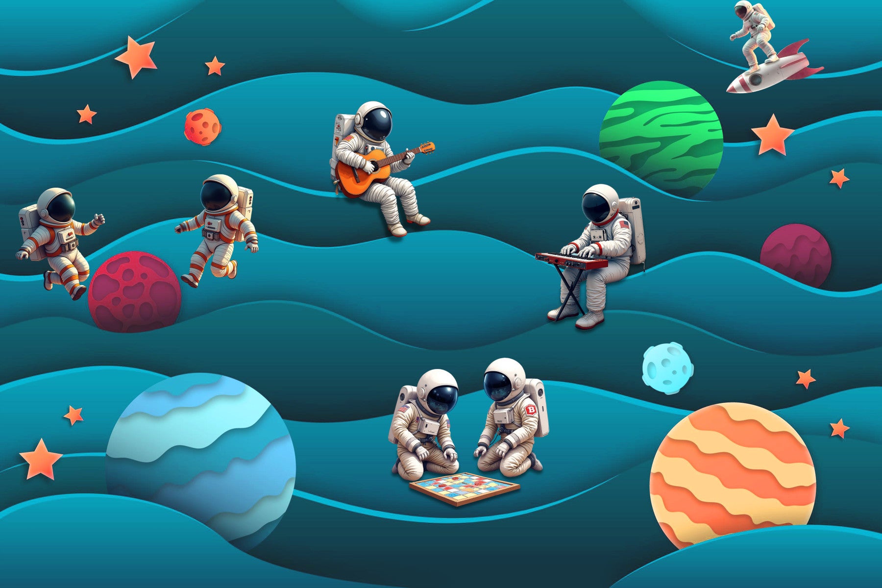 Blast off with this lively space-themed wallpaper. A crew of astronauts jams out among colorful planets. The teal backdrop and playful composition make it ideal for a kids' room or a fun, creative office. Add a touch of whimsy to any space. This wallpaper for walls promotes a sense of imagination, working perfectly for spaces that crave a cheerful and imaginative vibe. It transforms interiors into playful galaxies.