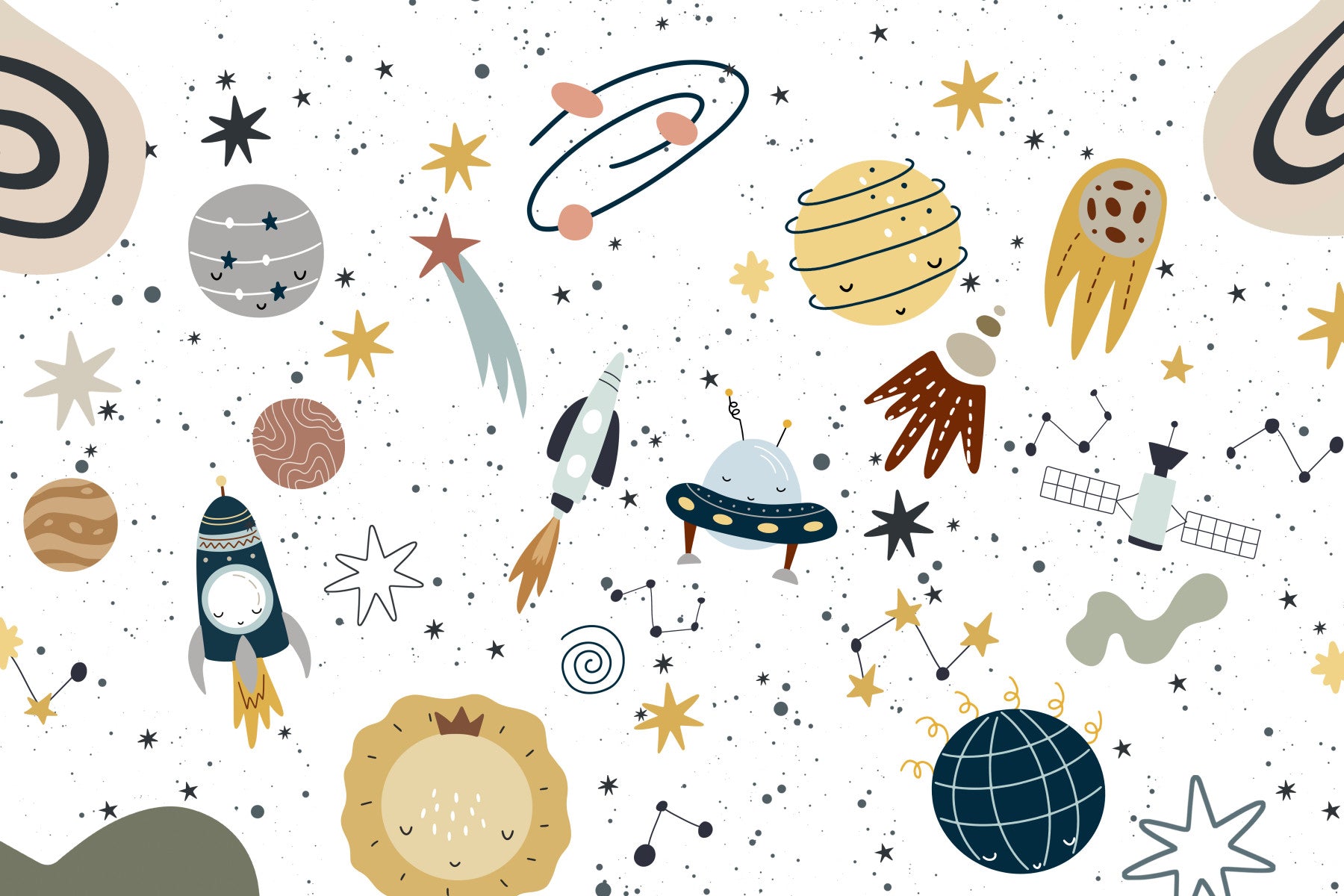 Let your child's imagination soar with this delightful space-themed wallpaper for walls! Rockets, planets, stars, and friendly extraterrestrial objects float across a clean white backdrop. The playful design features navy, beige, brown, gold, and light blue hues, creating a cheerful yet calming atmosphere. This cheerful wallpaper complements children’s bedrooms and nurseries, sparking curiosity and encouraging dreams of interstellar adventures. Introduce a hint of outer space to brighten up any room.