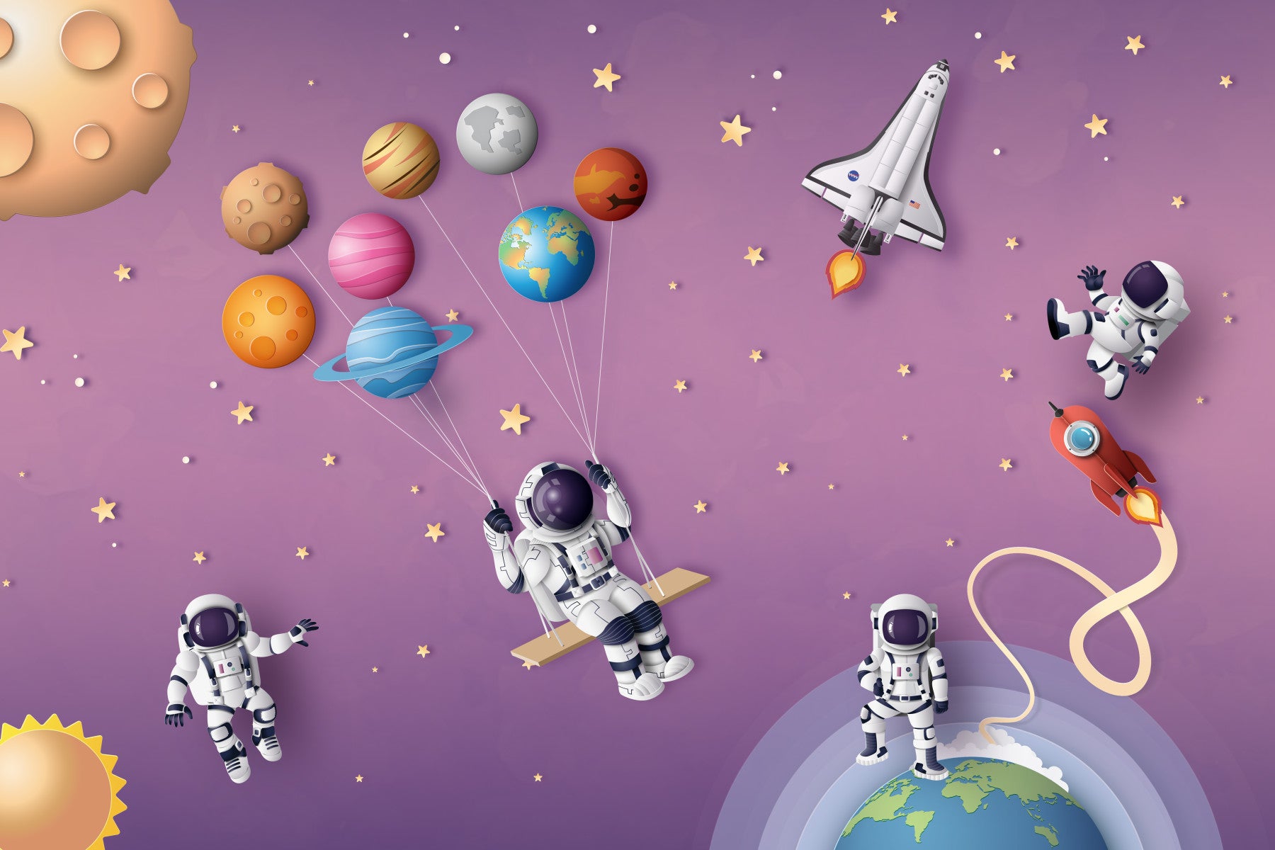 Launch your imagination with this delightful wallpaper for walls! A cheerful scene unfolds, featuring astronauts enjoying a cosmic swing amongst planets. Soft purples and pastel hues create a dreamy backdrop sprinkled with stars. This design adds a playful, educational vibe to kids' rooms, nurseries, or even a fun home office. It easily complements modern, minimalist or kids-themed interiors, fostering a sense of adventure and curiosity.