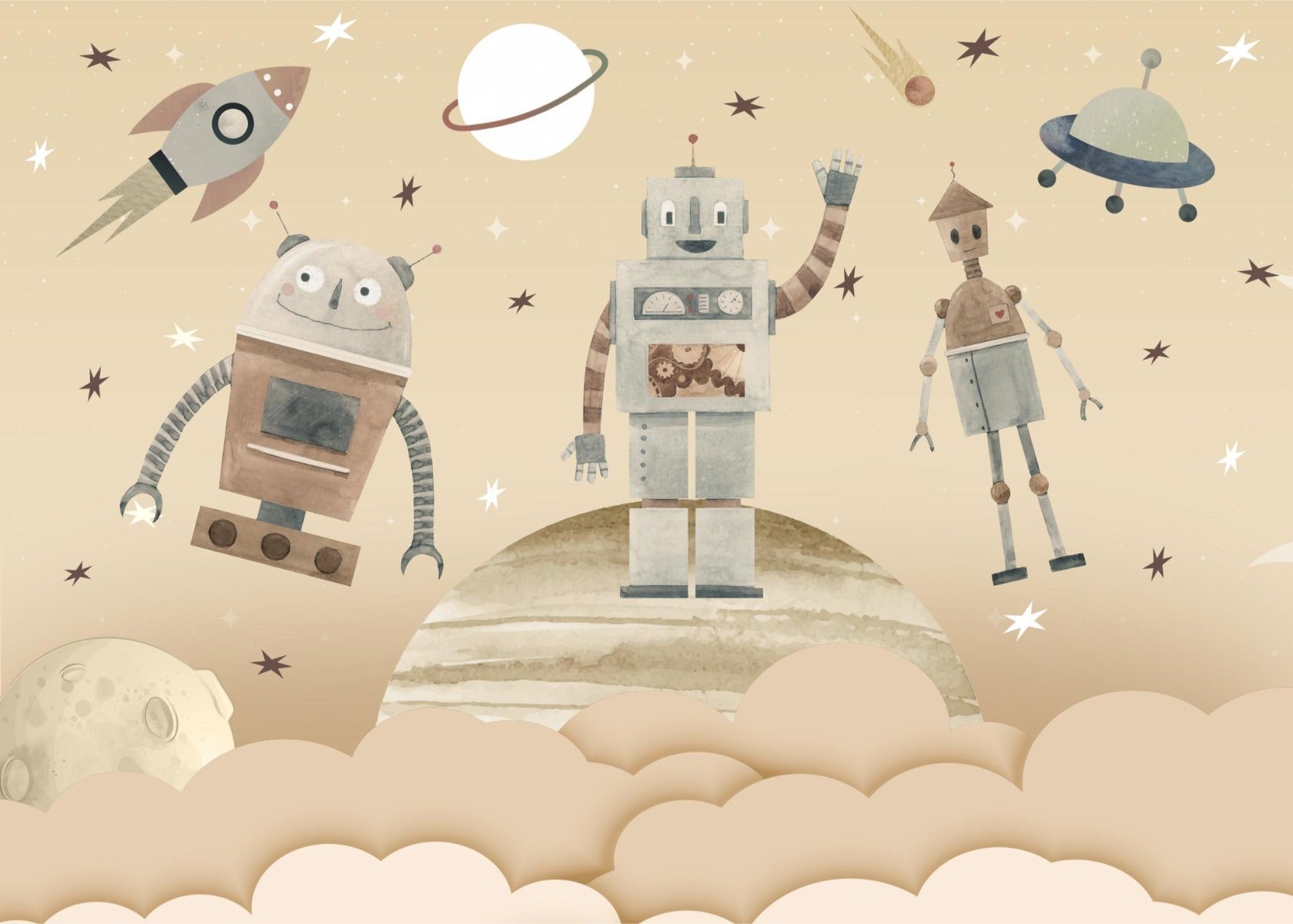 Nursery Wallpaper — Cosmic and Fun Robots in a different galaxy nursery, like a soaring wall of cosmic robots with your first robot friend as a nursery wallpaper to a world of adventure. The cheerful mural wall is an inviting place for the budding imaginations of any child to learn and be amazed by robots as they navigate through a soft colour palette full of intricate designs. Our wallpaper inspires your kid's dreams and the universe into the safety of their nursery. It is not even a mere visual indulgence but a sturdy and low-maintenance enhancement to add to the cosmos of your children.