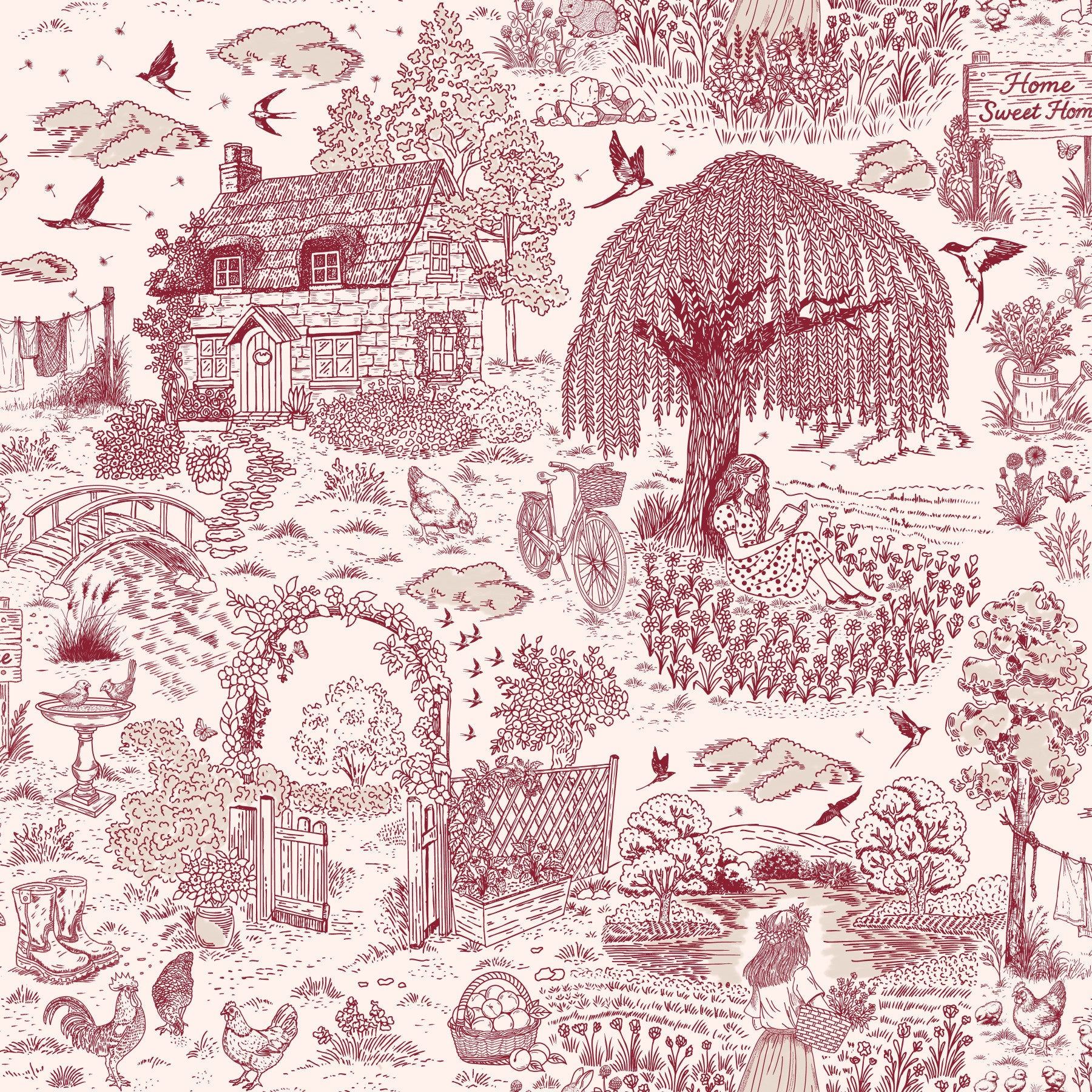Escape to a serene countryside retreat with our "Country Charm Toile Wallpaper". This enchanting design, presented in a classic toile style, evokes a sense of pastoral bliss and nostalgic warmth. The intricate details showcase a charming scene filled with storybook cottages nestled amidst lush gardens, complete with a picturesque bridge, a meandering stream, and playful farm animals roaming freely. Notice the whimsical touches – a girl reading peacefully under a willow tree, clothes drying on the line, and birds soaring through the sky. This wallpaper is ideal for creating a cozy and inviting atmosphere, perfect for bedrooms, nurseries, or any space where you desire a touch of rustic elegance and tranquility. Let the "Country Charm Toile Wallpaper" transform your walls into a captivating vista, bringing the timeless beauty of the countryside into your home.