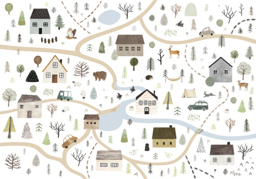 Our countryside charm mural adds enchanting countryside charm to invigorate your child with curiosity and joy. Depicting a pastoral setting day, this kid's map wallpaper is a doorway for various storytelling adventures. In those illustrated forests, fields, and villages, your children will interact with their surroundings in ways no textbook can achieve. Their bedroom or play area is an excellent canvas of creativity and naturalistic passion. It is a fun and educational presentation for storytelling, playtime, and learning that sparks the child's curiosity about the countryside.