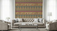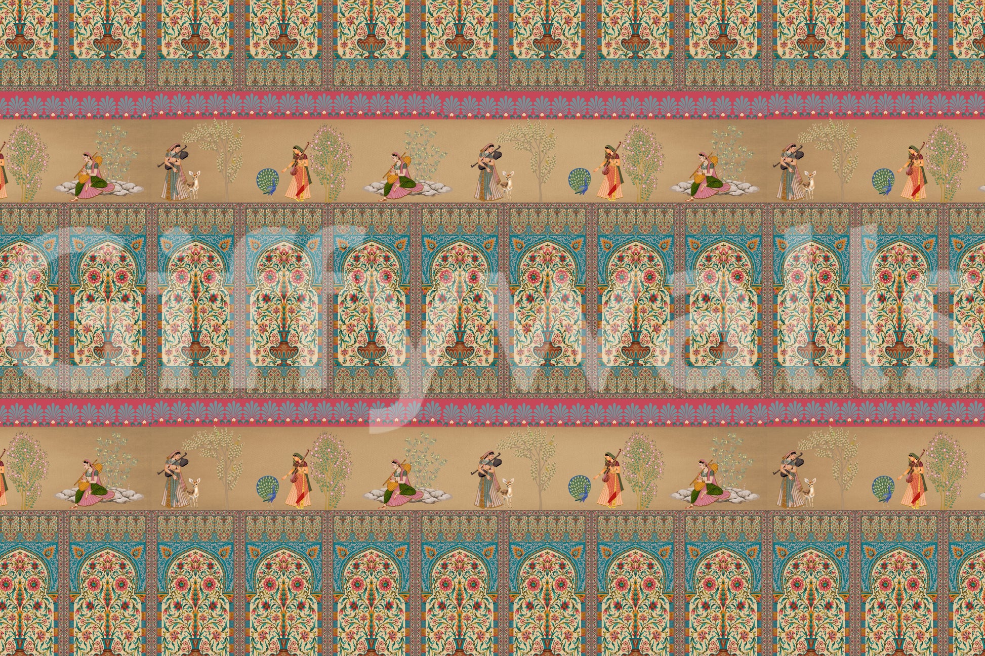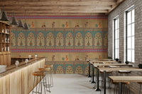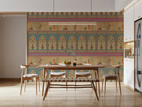 Infuse your home with the charm of a royal garden using this ornate wallpaper for walls. The design features musical figures set against a backdrop of stylized trees, flowers, and architectural motifs. The color scheme blends soft beiges with vibrant teals, corals, and greens. This mural brings a timeless elegance to living spaces, enhancing the ambiance of dining rooms and bedrooms. Its intricate patterns and soothing palettes make it suitable for creating a refined entryway or a tranquil reading nook. The elaborate detail introduces an element of classic sophistication to your décor, infusing the space with artistic allure.