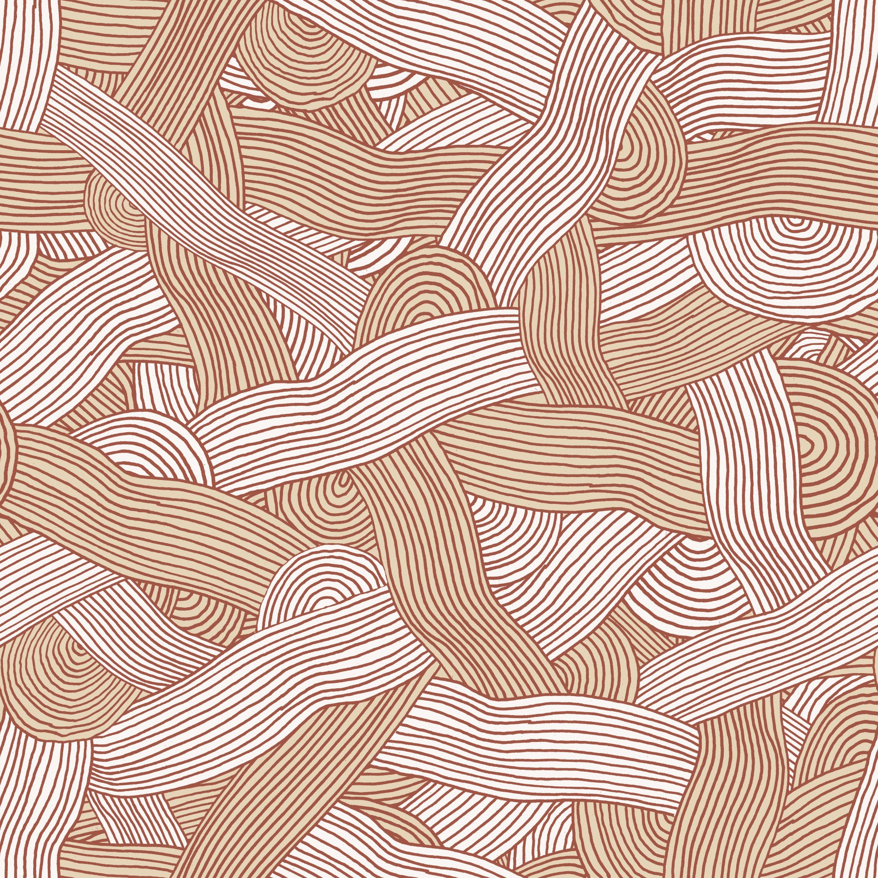 Woven Sands is a captivating wallpaper design featuring an intricate interplay of beige and terracotta lines, creating a mesmerizing textured effect. The seamless pattern evokes a sense of warmth and calm, reminiscent of sun-drenched dunes or flowing fabrics. Its organic, hand-drawn quality lends a touch of artistry and sophistication, making it perfect for adding a touch of understated elegance to any room. The neutral color palette allows it to blend seamlessly with various interior styles, from minimalist to bohemian. Let the rhythmic lines and earthy hues create a tranquil atmosphere in your space.