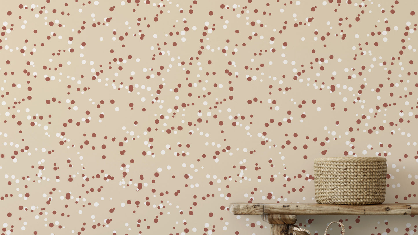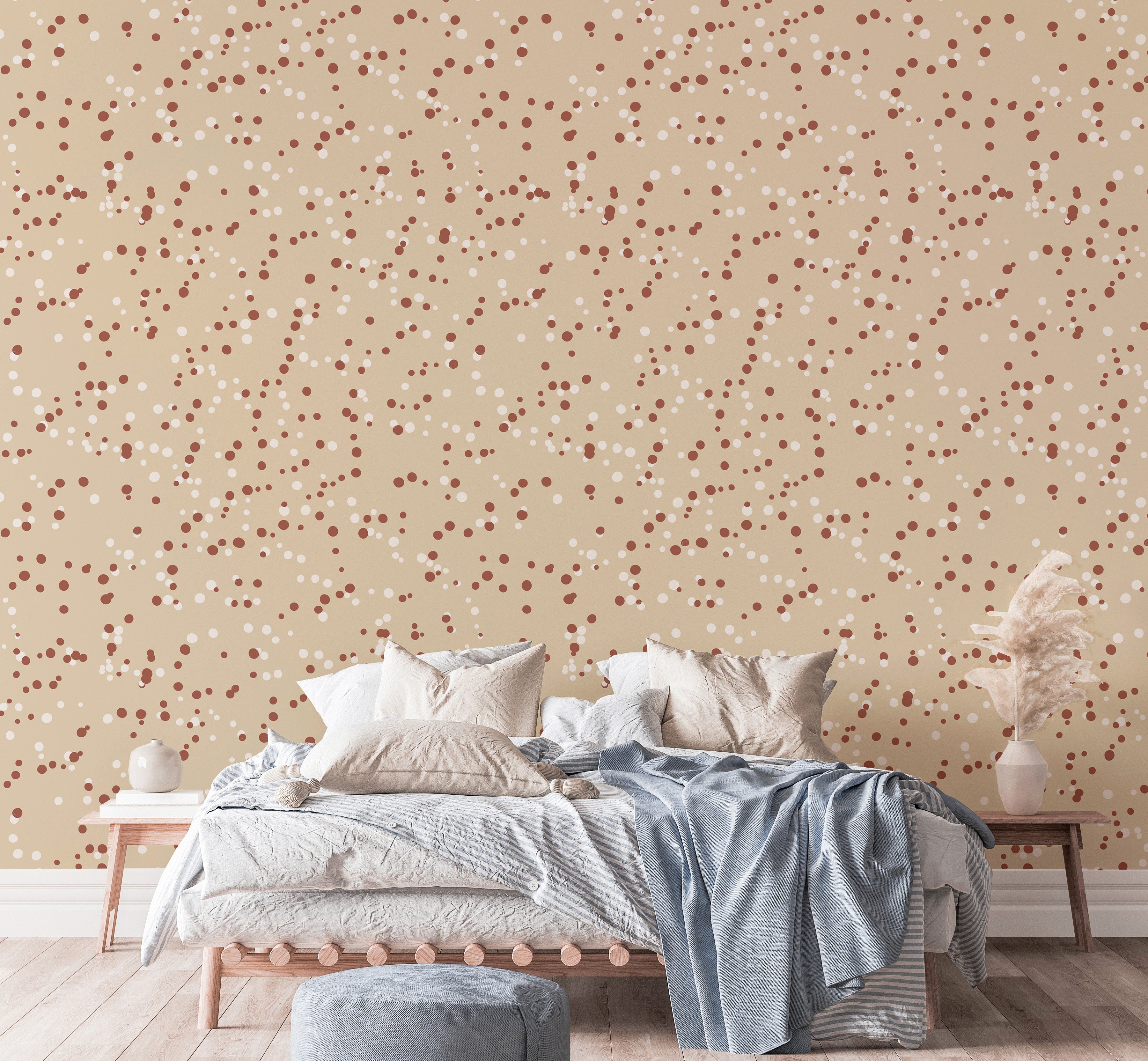 This wallpaper features a minimalist design of scattered circles in soft terracotta and off-white hues against a calming beige background. The varying sizes and distribution of the circles create a subtle, yet engaging pattern that adds a touch of understated elegance to any space. Its neutral color palette makes it versatile enough for various rooms and design styles, from bedrooms to offices, seamlessly blending with existing décor. The organic feel of the slightly imperfect circles adds a touch of handmade charm, creating a tranquil and inviting atmosphere.