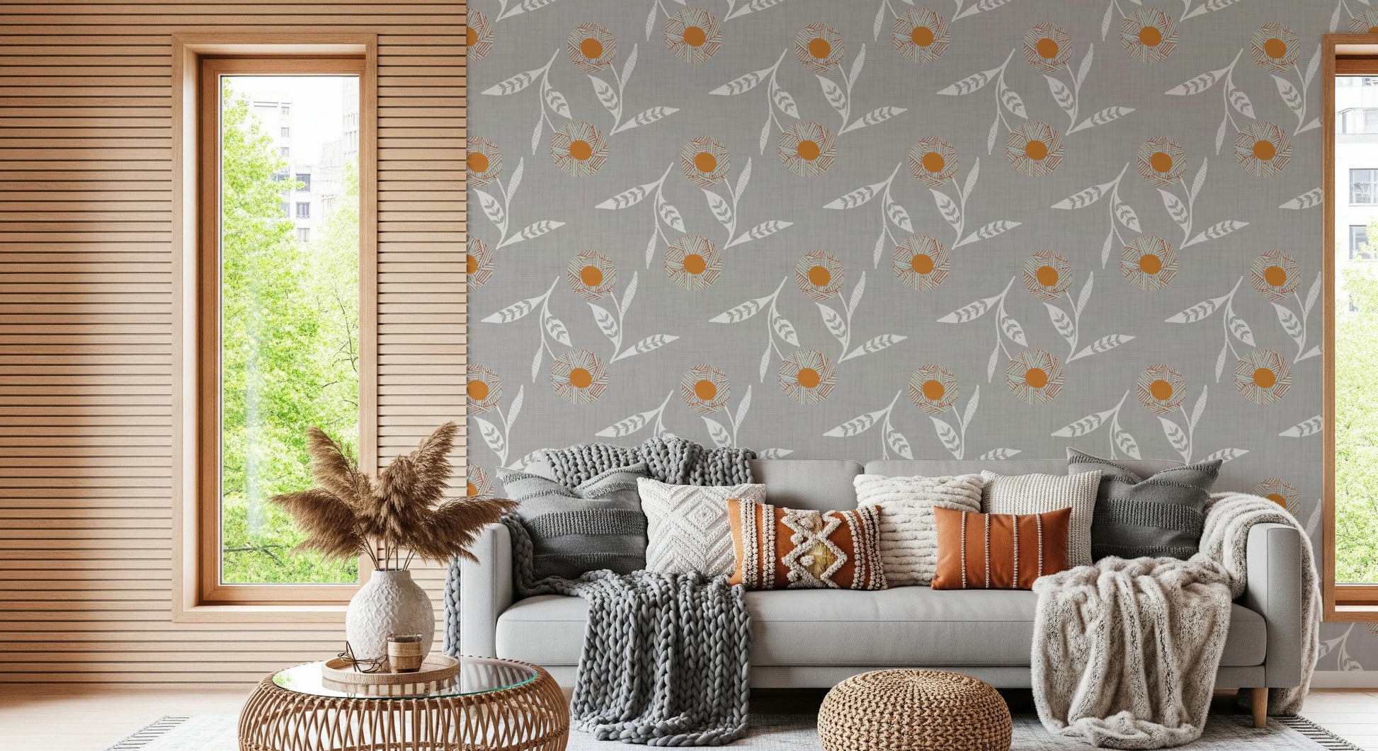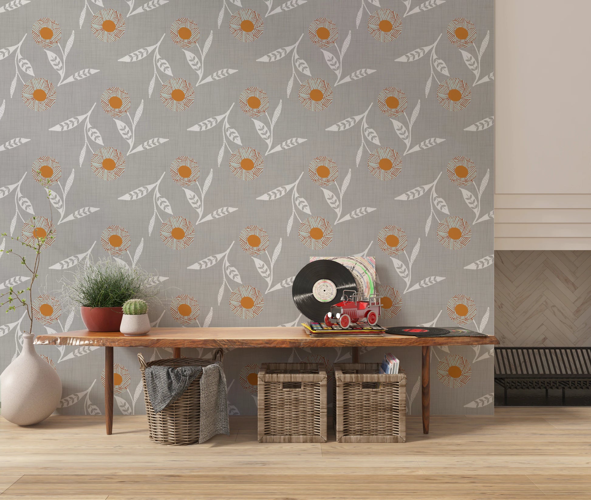 Embrace the serene charm of Scandinavian design with our 'Cozy Scandi Flower Warm Linen' wall covering. This craft botanical pattern presents stylized floral motifs, marrying rustic warmth with minimalist elegance. Delicate, white floral stems dance across a subtly textured, linen-look background, creating a soothing visual experience. The stylized flowers, featuring a warm orange center and unique linear detailing in muted hues, bring a touch of artistic craftsmanship to any room. This understated yet captivating design evokes a sense of calm and natural beauty, perfectly complementing a modern, cozy, or nature-inspired interior. Infuse your space with the tranquil simplicity of Scandi style and the gentle allure of botanical art.