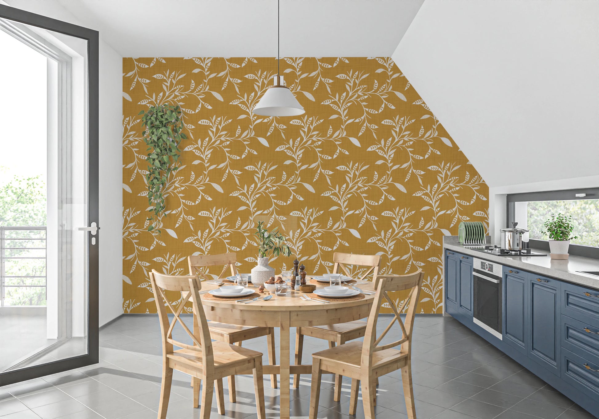 Embrace the warmth of Scandinavian simplicity with this folk-inspired wall covering. The "Cozy Scandi Folk Leaf Vine Honey Mustard" design features delicate, hand-crafted style leaf vines in a soft, creamy white against a comforting honey mustard backdrop. The textured background adds depth, creating a soothing and inviting ambiance for any space. Perfect for bringing a touch of rustic charm and a sense of calm into your home. Imagine a warm, sunlit room where the simple beauty of nature is celebrated. This design evokes a feeling of hygge, offering a timeless and elegant aesthetic that complements a variety of interior styles. A true craft blend of nature-inspired design and soothing colors.