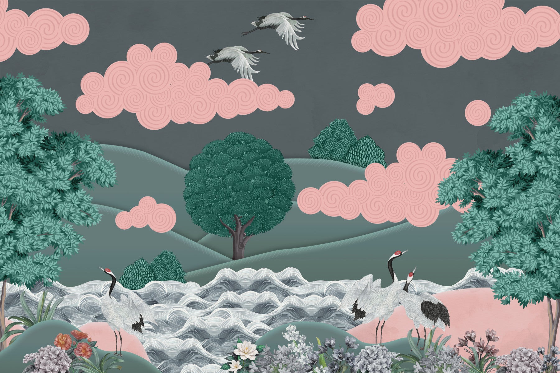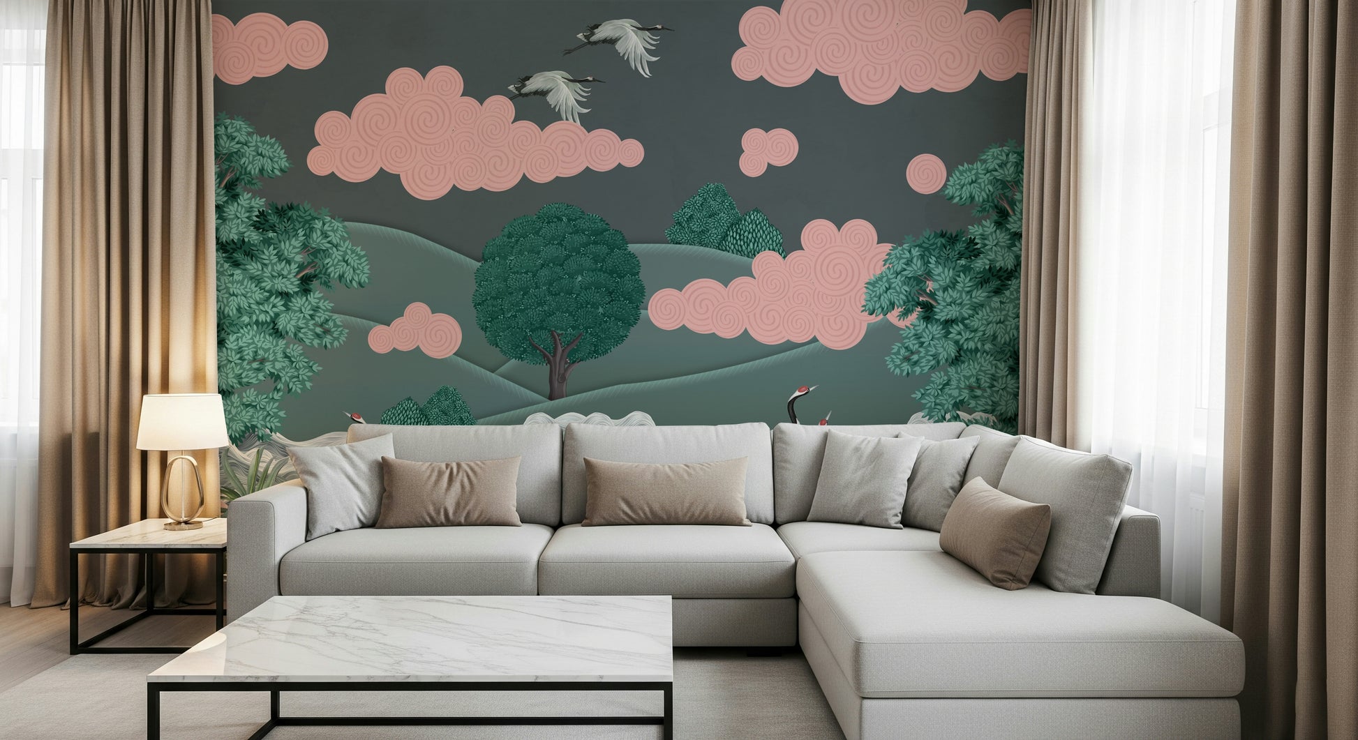 Invite a sense of calm into your home with this serene landscape design. A muted palette of teal, gray, and blush pinks creates a dreamy scene with swirling cloud formations. Delicate cranes add a touch of elegance, making this wallpaper for walls a perfect choice for bedrooms, living rooms, or even a tranquil office space. The artistic style and balanced composition will effortlessly complement minimalist or modern interiors.