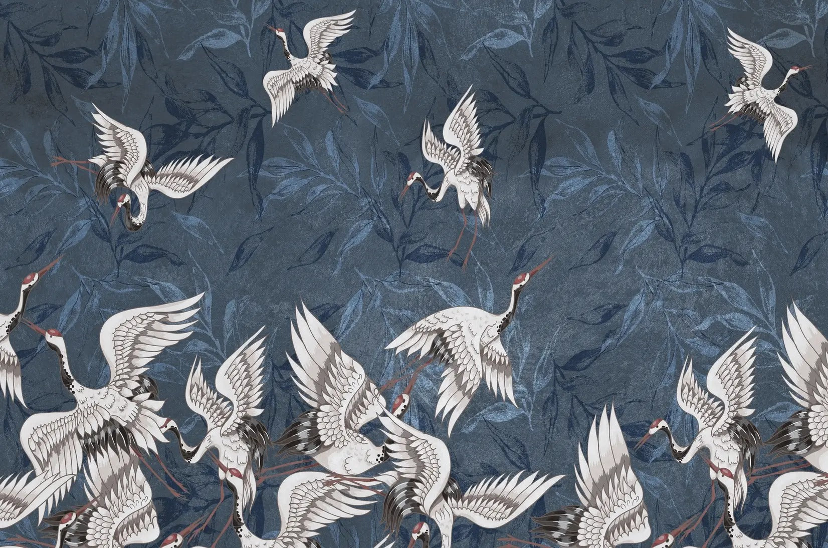 Introducing the cranes grunge wallpaper mural piece sure to bring elegance into your walls. The deep blue background, as well as this intricate crane design, gives a sophisticated, artistic feel to these walls. This blue wallpaper will bring class to any room, such as the living space, bedroom, or office, with its unique balance of style, making it a perfect fit for any interior theme, from modern to classic decor. The mural's highly detailed illustration and rich hue give a visual effect, changing your space. Make a statement by decorating your home with this beautiful mural. Order today, free delivery: convenient and delightful shopping.