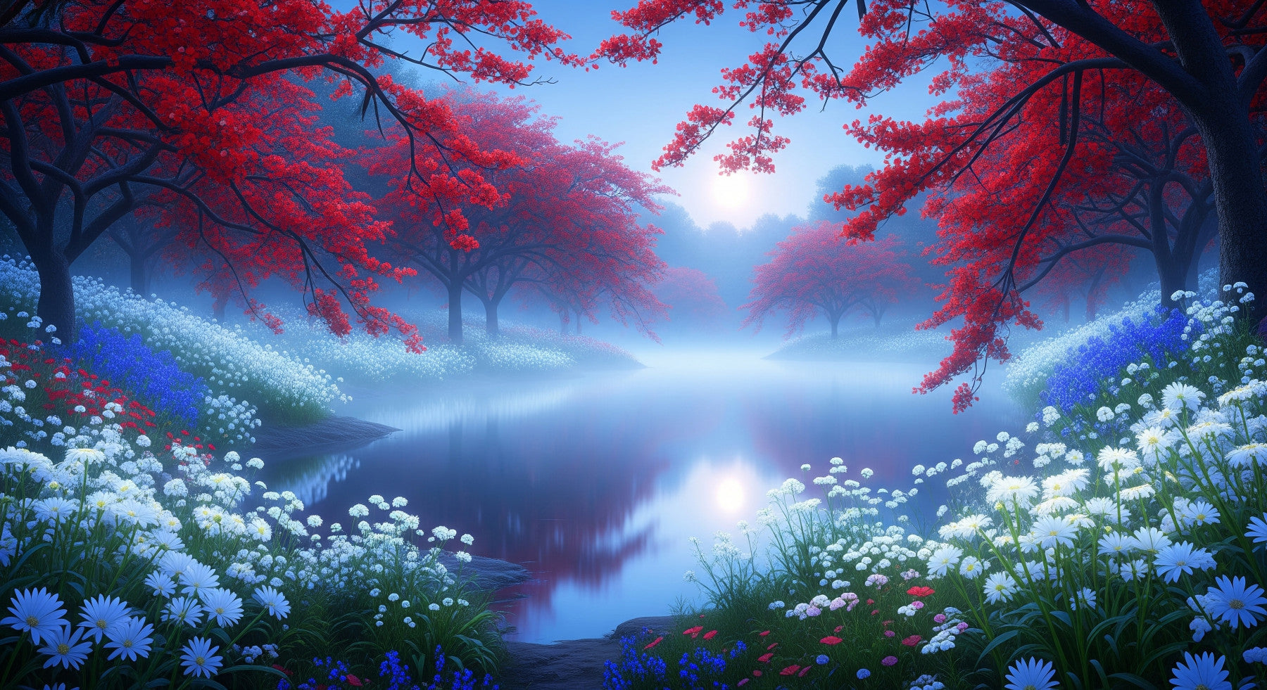 Immerse yourself in a serene landscape where vibrant red trees frame a tranquil lake. The soft blues and whites of the wildflowers contrast with the intense reds, creating a dreamy, peaceful mood. This stunning wallpaper for walls brings nature's beauty indoors and complements bedrooms, living rooms, or any space needing a touch of tranquility and bold color. Its serene imagery and vibrant colors turn any room into a peaceful escape, making it a wonderful addition to your home decor.