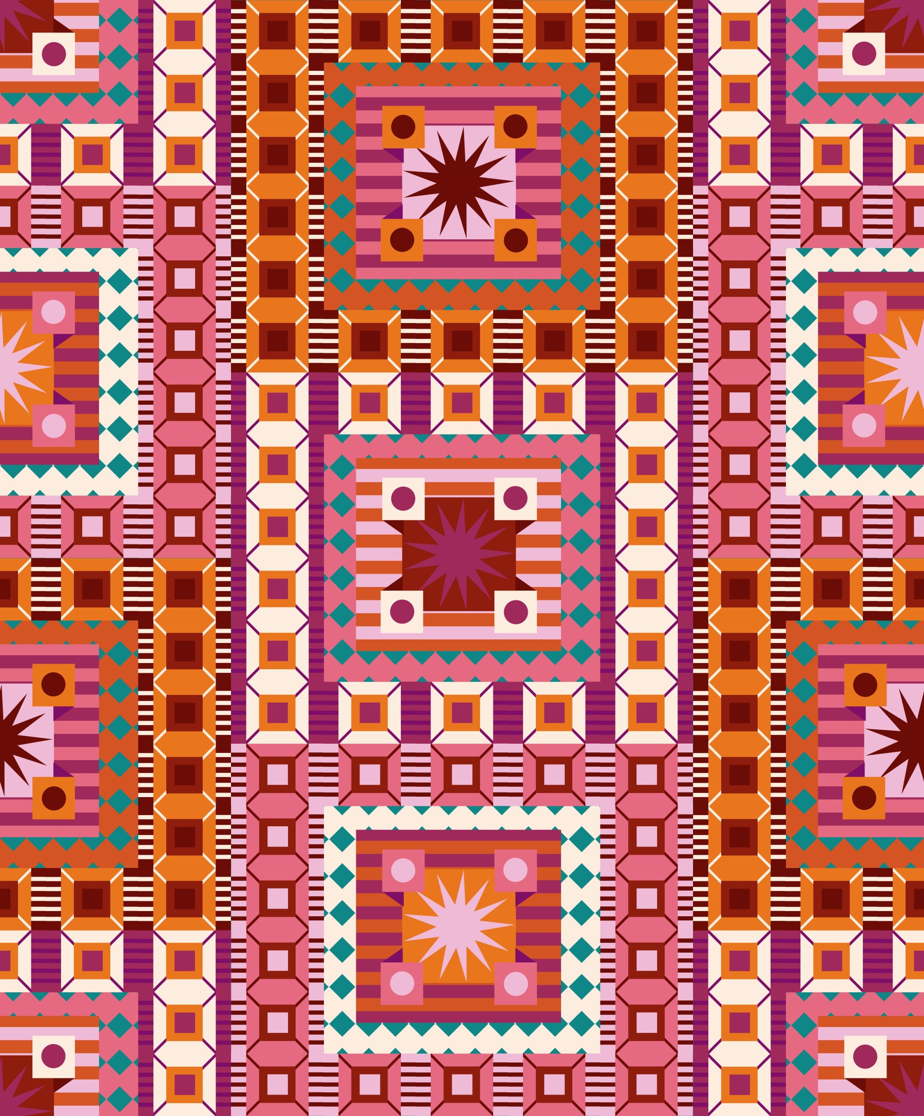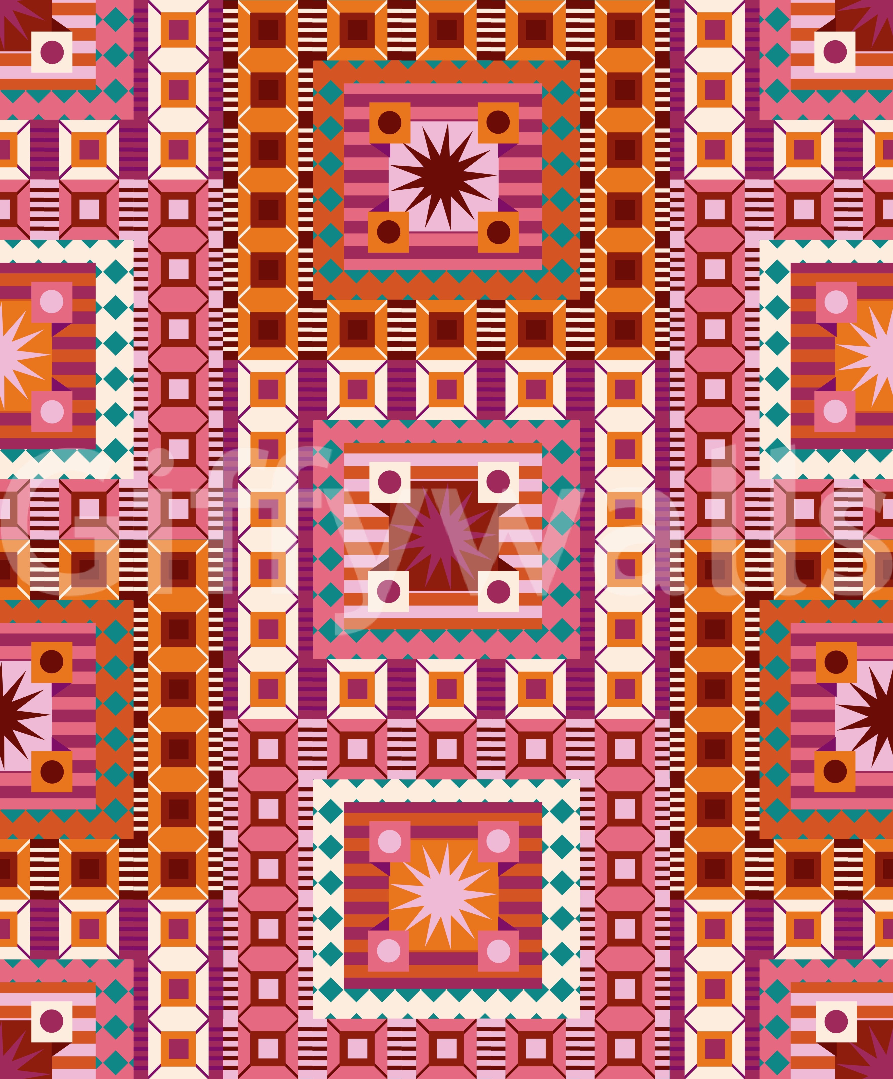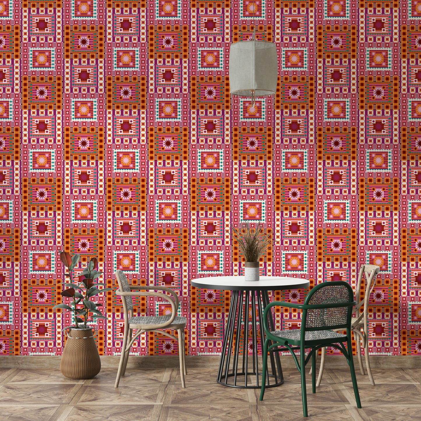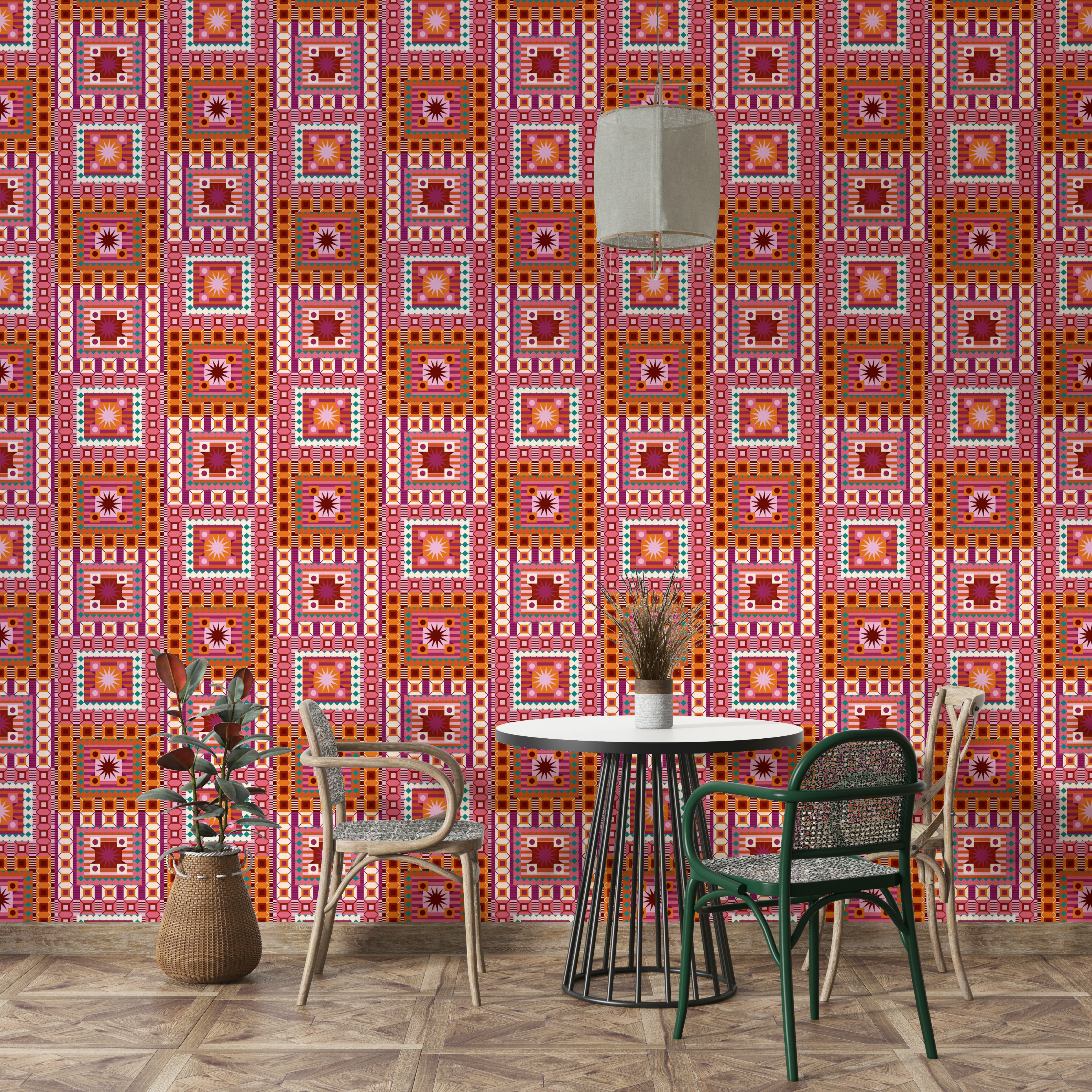 Experience a dynamic interplay of color and shape with this striking wallpaper. The bold use of crimson, orange, and teal creates a powerful visual statement. Geometric forms are masterfully layered, building a complex yet balanced pattern. The repeating motif of starbursts adds a touch of playful energy, while the overall effect is sophisticated and modern. Perfect for those seeking a wallpaper with personality and impactful design, this piece will surely be a conversation starter.