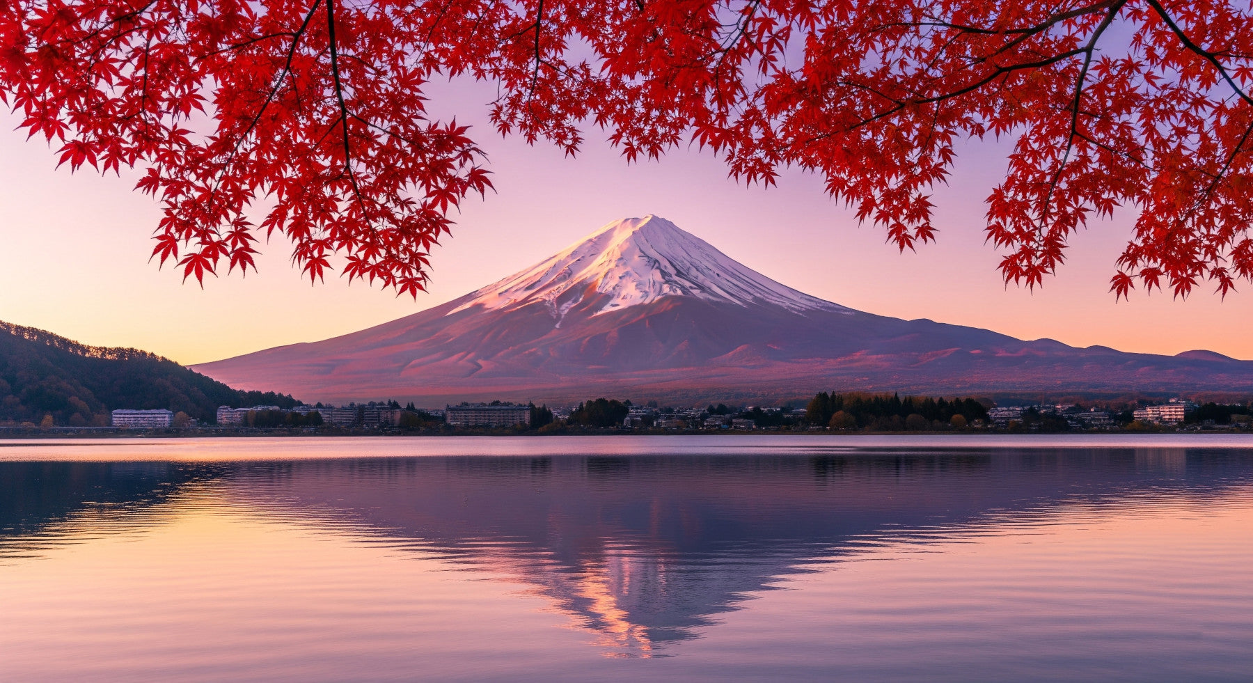 Elevate your interior design with this captivating wallpaper for walls, showcasing the iconic Mount Fuji bathed in the soft glow of dawn. The striking contrast between the snow-capped peak and the vibrant crimson foliage offers a visually stunning experience. The gentle ripples on the water's surface create an immersive feel, adding depth to any room. This unique design works perfectly in bedrooms, meditation spaces, or even entryways, inviting a sense of calm and sophistication. Introduce a touch of nature's splendor and let this landscape become a seamless extension of your personal style, enhancing the overall ambiance of your home.