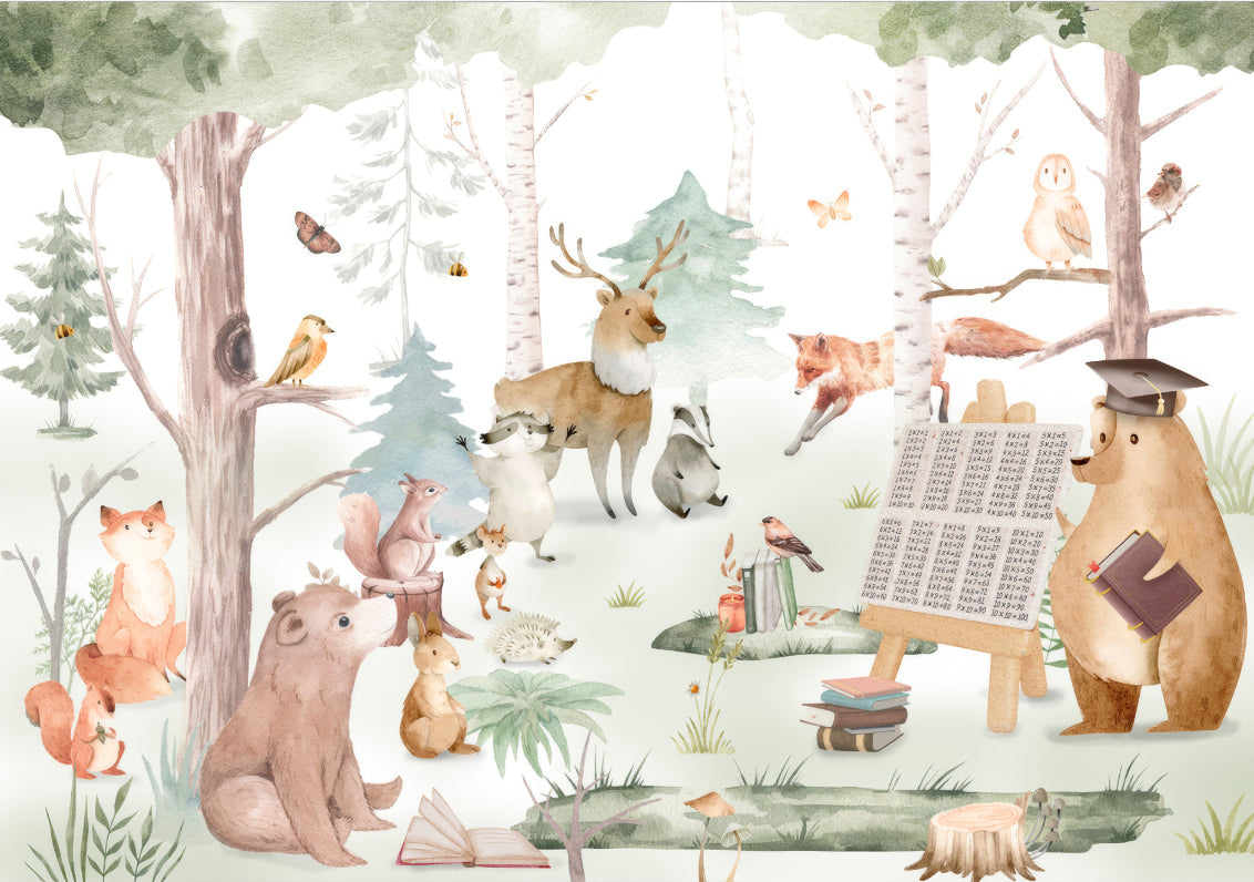 Our critter classroom mural wallpaper is an excellent option for providing a new and alluring feel to any children's bedroom. It is a colourful scene of woodland creatures assembled in a classroom context, offering a fun/educational base for nurseries and playrooms. This nursery wallpaper is made with good quality material and is strong enough to bear the strong activities of children and is easy to clean. Playful and didactic images decorate the room and are an excellent pedagogic tool, fostering a love for nature and a desire to learn in children.
