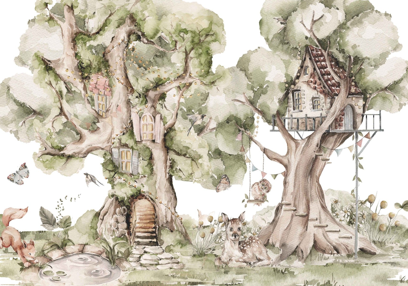 Help to create a sense of joy and creative thinking in your child's room by investing in the critter cottage mural. Vibrant animal community shouts and excellent treehouse dwellings serve as an enchanting background for telling stories that will make the children love it. The soothing watercolour colour balance blends well with any other room decor, making this wallpaper the perfect backdrop for storytelling at bedtime and imaginative adventure playtimes during the day. This mural adds beauty to the child's space and, at the same time, develops an atmosphere supporting creative play and study. Make this mural a part of your child's room and make their place a grand haven where they can explore, learn, and dream.