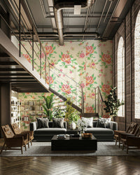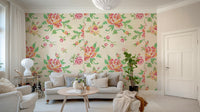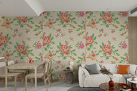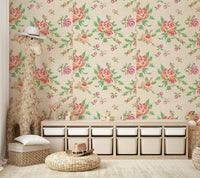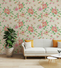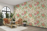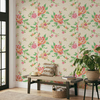 Bring a touch of handcrafted charm to your home with this delightful floral wallpaper. The cross-stitch design evokes a sense of cozy comfort with a pattern mimicking traditional embroidery. The blooms in shades of pink, red, orange, and green pop against the beige background, creating a warm and inviting atmosphere. This wallpaper for walls suits various spaces, particularly living rooms, bedrooms, and dining rooms, adding a soft, vintage flair that complements both modern and classic interiors.