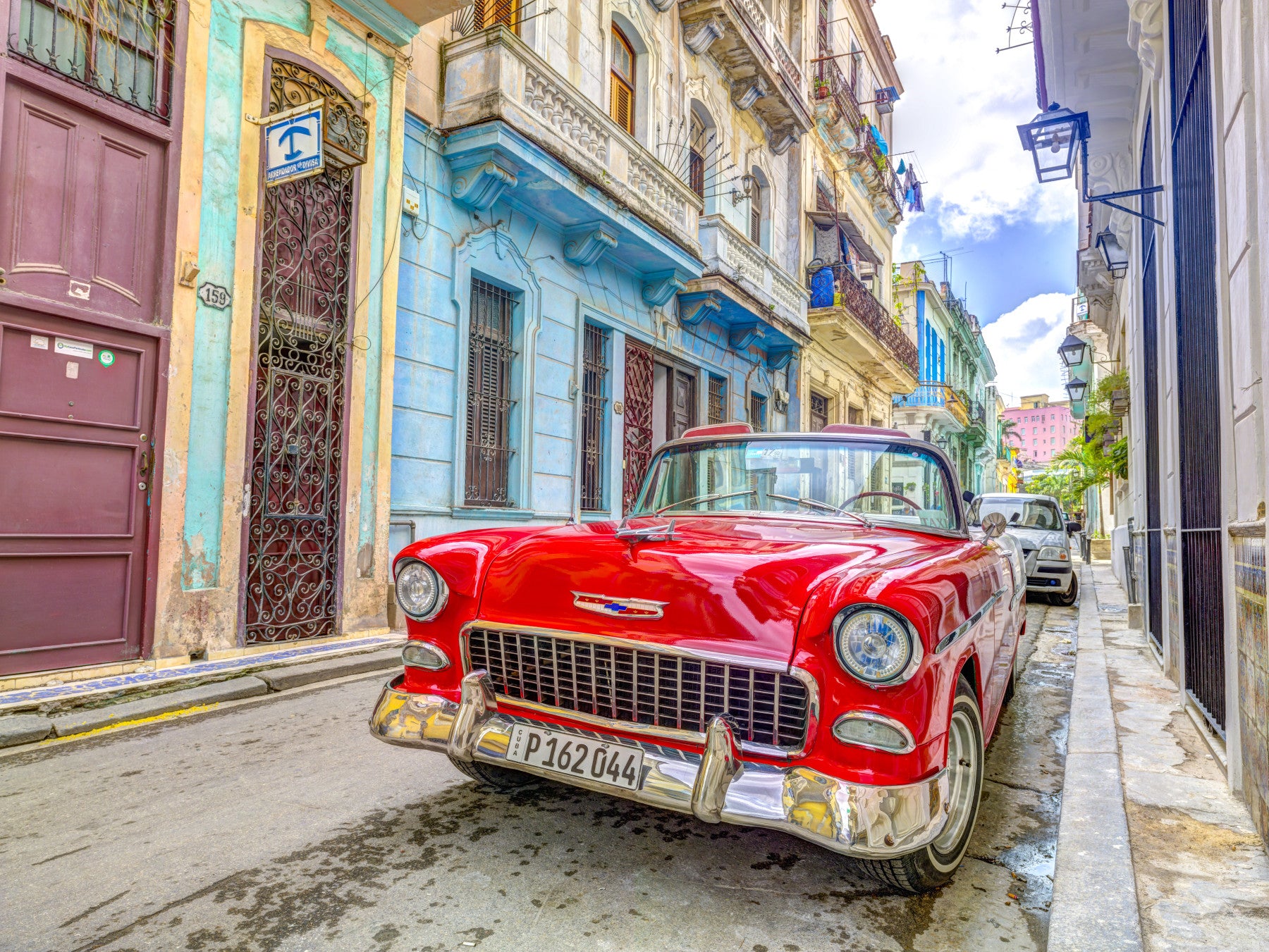 This wallpaper transports you to the sun-kissed streets of Havana, Cuba. A dazzling red classic car, a quintessential symbol of the island, sits parked along a charming street. The buildings' faded pastel colors and the car's glossy sheen create a captivating contrast, while the warm sunlight hints at a magical sunset. This image is a breathtaking blend of vintage charm and vibrant energy, blending old-world architecture with the thrill of classic American automobiles. The overall mood is serene yet exhilarating, promising adventures and memories. It's perfect for adding a touch of sophisticated nostalgia and island flair to any room.