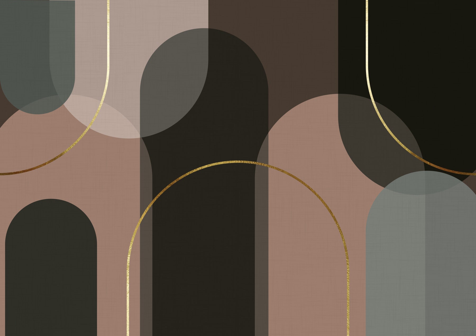 This wallpaper for walls features an intriguing geometric design with overlapping arches and vertical lines. A refined touch comes with the golden curves accentuating the design. The style leans into modern art deco, using a color palette of brown, beige, black, and gray. It's a perfect choice for a living room, dining room, or hallway, offering a sophisticated statement. It blends seamlessly with furniture, adding visual interest without overwhelming the space.