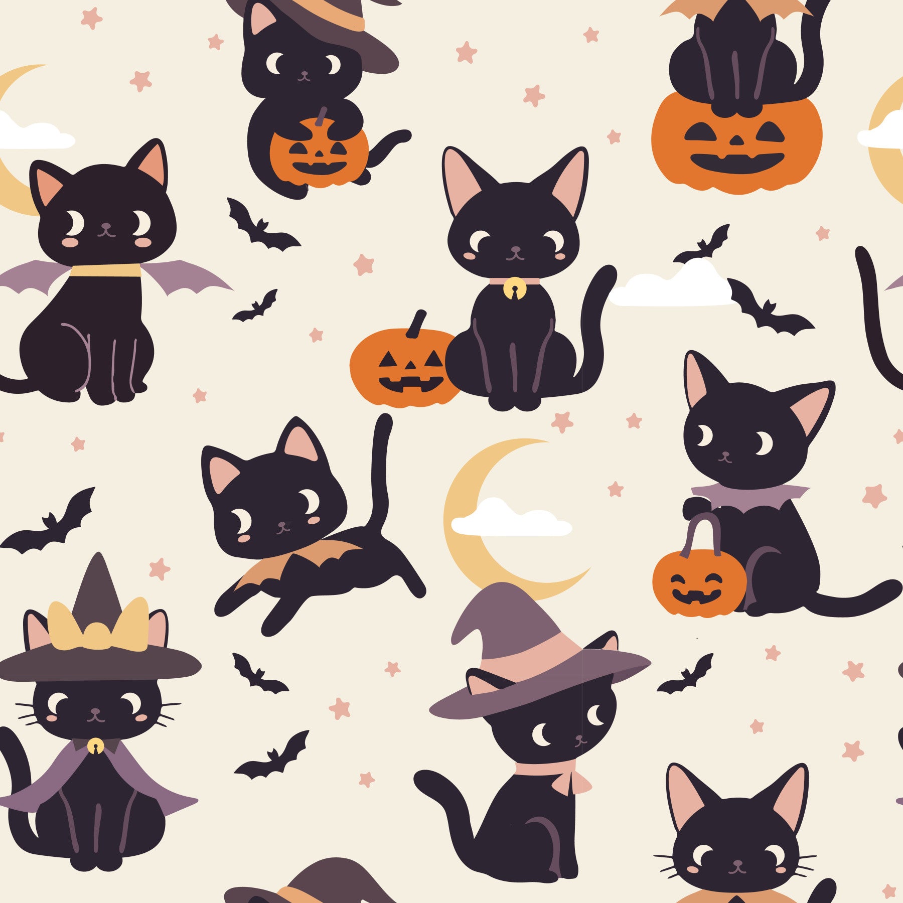 A repeating pattern of cute Halloween cats and pumpkins.