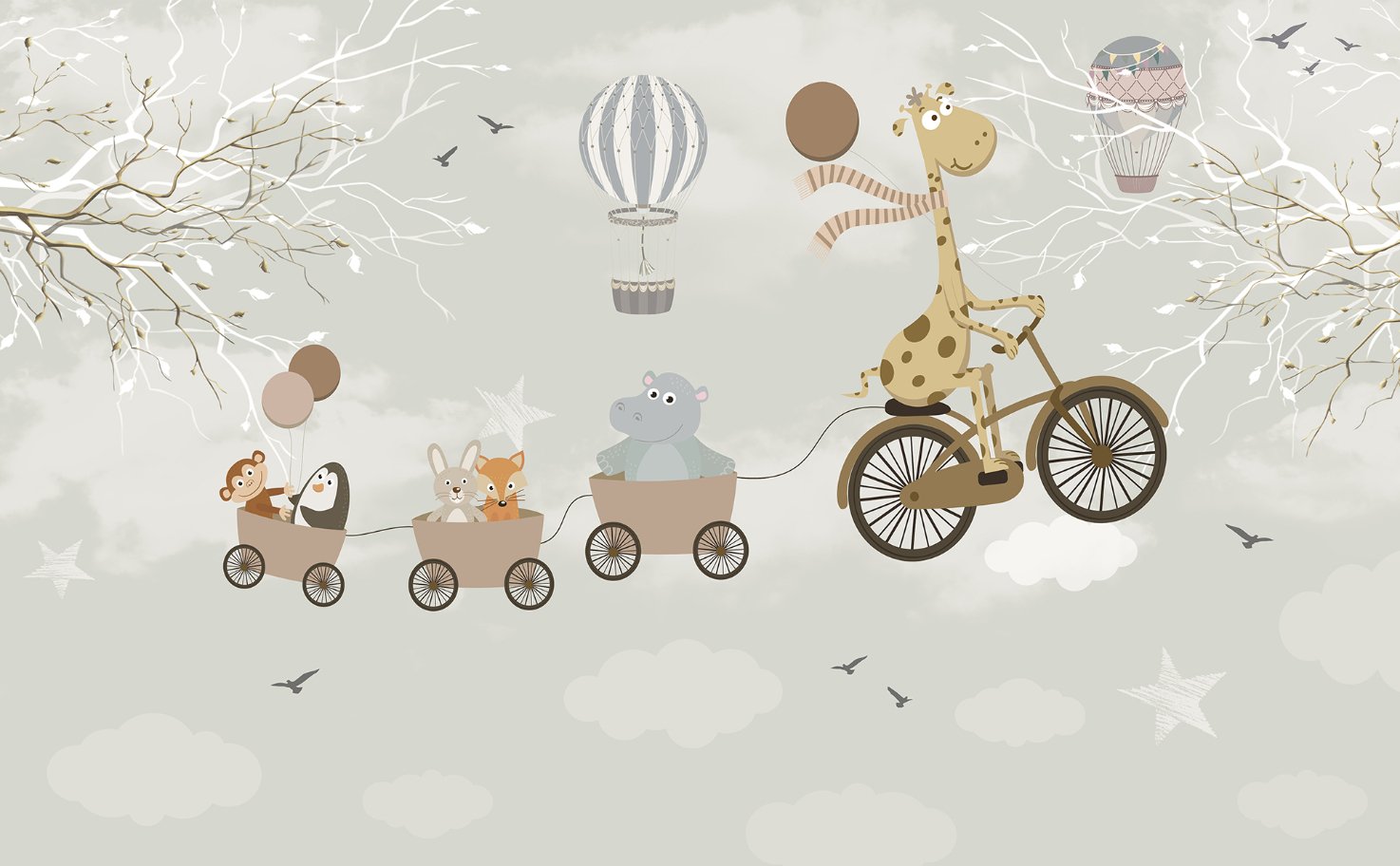 Let the magic of the animal kingdom be a part of your child's haven with our cute animals cycling nursery wallpaper. This enchanting grey wallpaper, created to inspire the imagination of both children and adults, is the right amount of fun and glamour. Each panel is alive with beautifully illustrated creatures on a gentle cycling adventure, set against a soft, versatile grey backdrop that complements any nursery decor. The playful design encourages storytelling and dreams, making it more than just nursery wallpaper. It's a gateway to a world of wonder. Easy to install and maintain, our wallpaper is a perfect option to build a welcoming, creative environment where your child's imagination can be unleashed with their new animal buddies. Turn your nursery into a fairy tale painting with this magical mural.