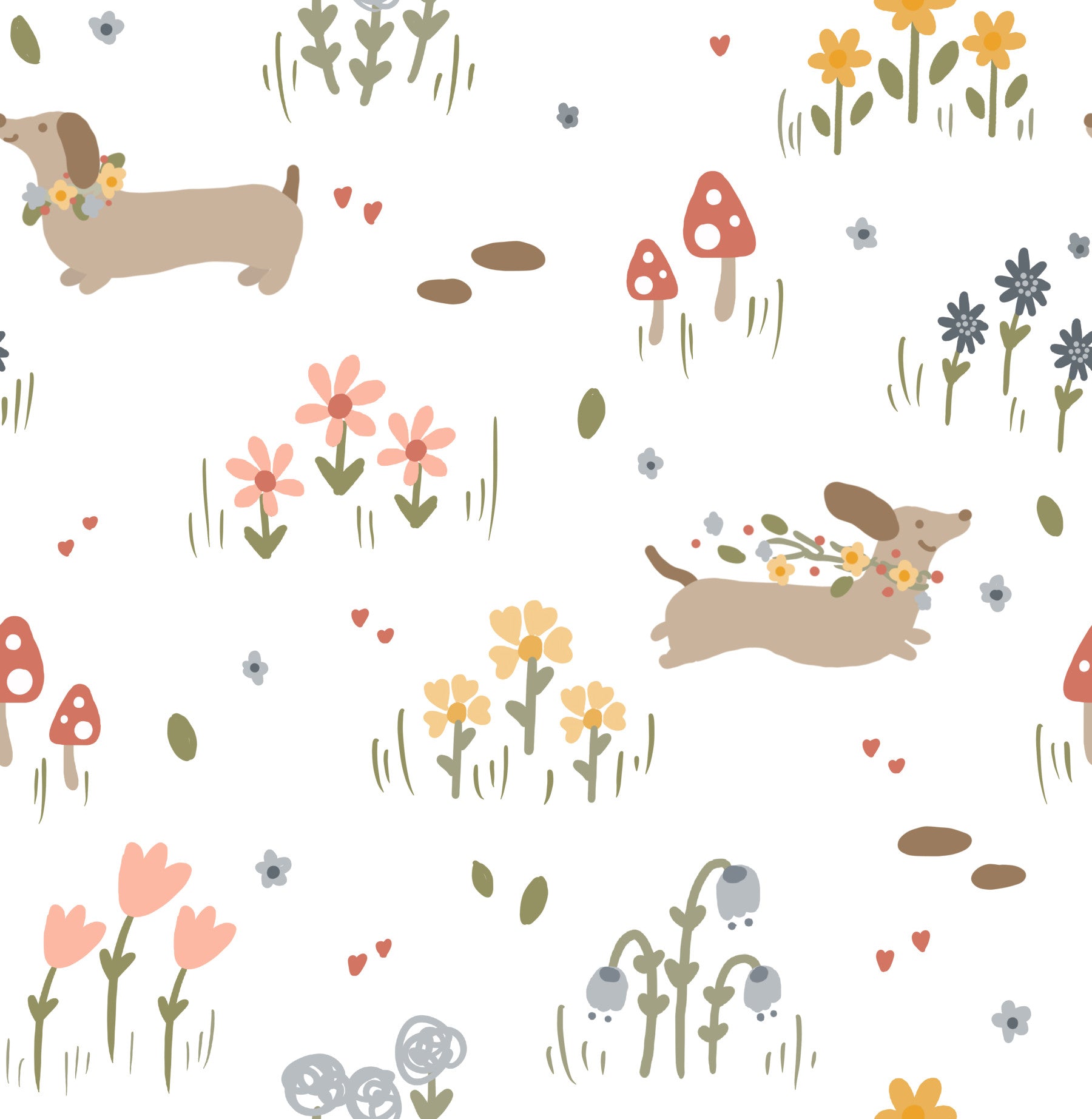 Delight in this charming wallpaper featuring adorable Dachshunds frolicking amidst a vibrant meadow of wildflowers. Pastel-colored blooms, whimsical mushrooms, and scattered hearts create a joyful and whimsical atmosphere. The simple yet expressive style of the Dachshunds, adorned with floral wreaths, adds a touch of playful elegance. Perfect for bringing a touch of springtime cheer and gentle charm to any digital device.