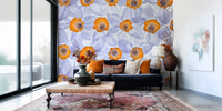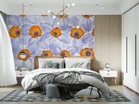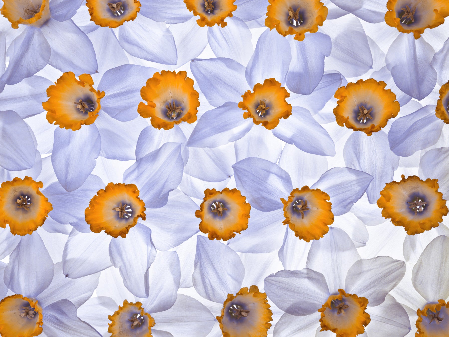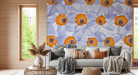 Daffodils arrangement in full frame. Introduce a tranquil spring vibe to any room with this daffodil-themed wallpaper for walls. Soft, ethereal petals in shades of pale blue and white surround bright orange centers, creating a gentle and inviting ambience. This seamless floral design adds a subtle elegance, making it a perfect choice for bedrooms, bathrooms, or living rooms. Transform your space with this graceful floral backdrop and enjoy a soothing atmosphere every day. It also enhances natural light and complements both modern and classic interiors.