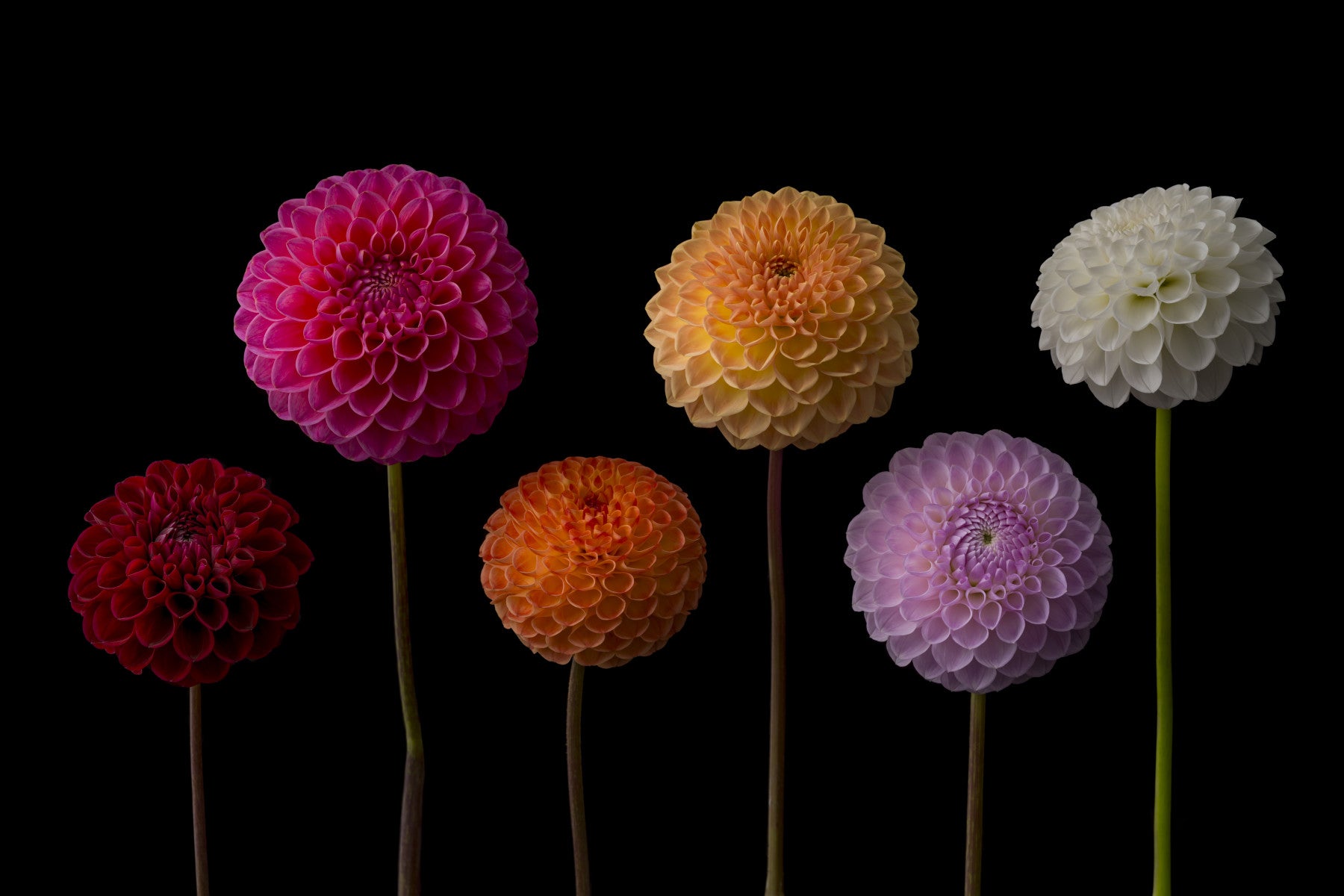 A captivating wallpaper featuring six vibrant dahlia blooms, each a unique shade transitioning seamlessly from deep red to soft lavender. The rich colors pop against a stark black background, creating a sophisticated and elegant aesthetic. The image is meticulously detailed, showcasing the intricate petal structure of each dahlia. The symmetrical arrangement enhances the overall harmony and visual appeal, making it an ideal choice for adding a touch of refined beauty to any room. The mood is serene and calm, inviting a sense of tranquility and understated elegance.