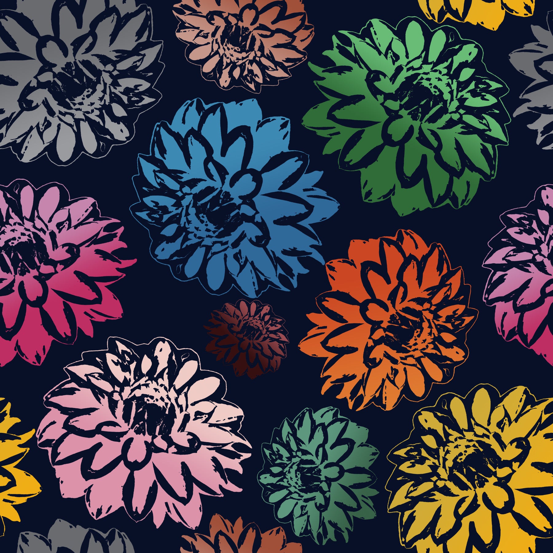 This wallpaper is a Dahlias Colors Navy design, a unique repeating pattern with a modern, artistic style. It's a great wallpaper for walls for a living room, bedroom, or any space that needs a vibrant feel. The design features stylized dahlia flowers in a mix of pink, blue, green, and orange, set against a dark navy blue background. Made from high-quality, durable material, this wallpaper is a simple and quick way to refresh your home decor with a one-of-a-kind look.