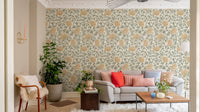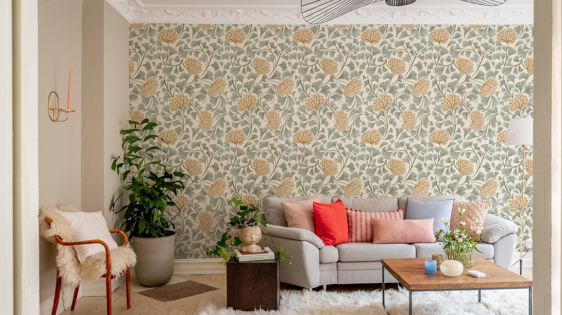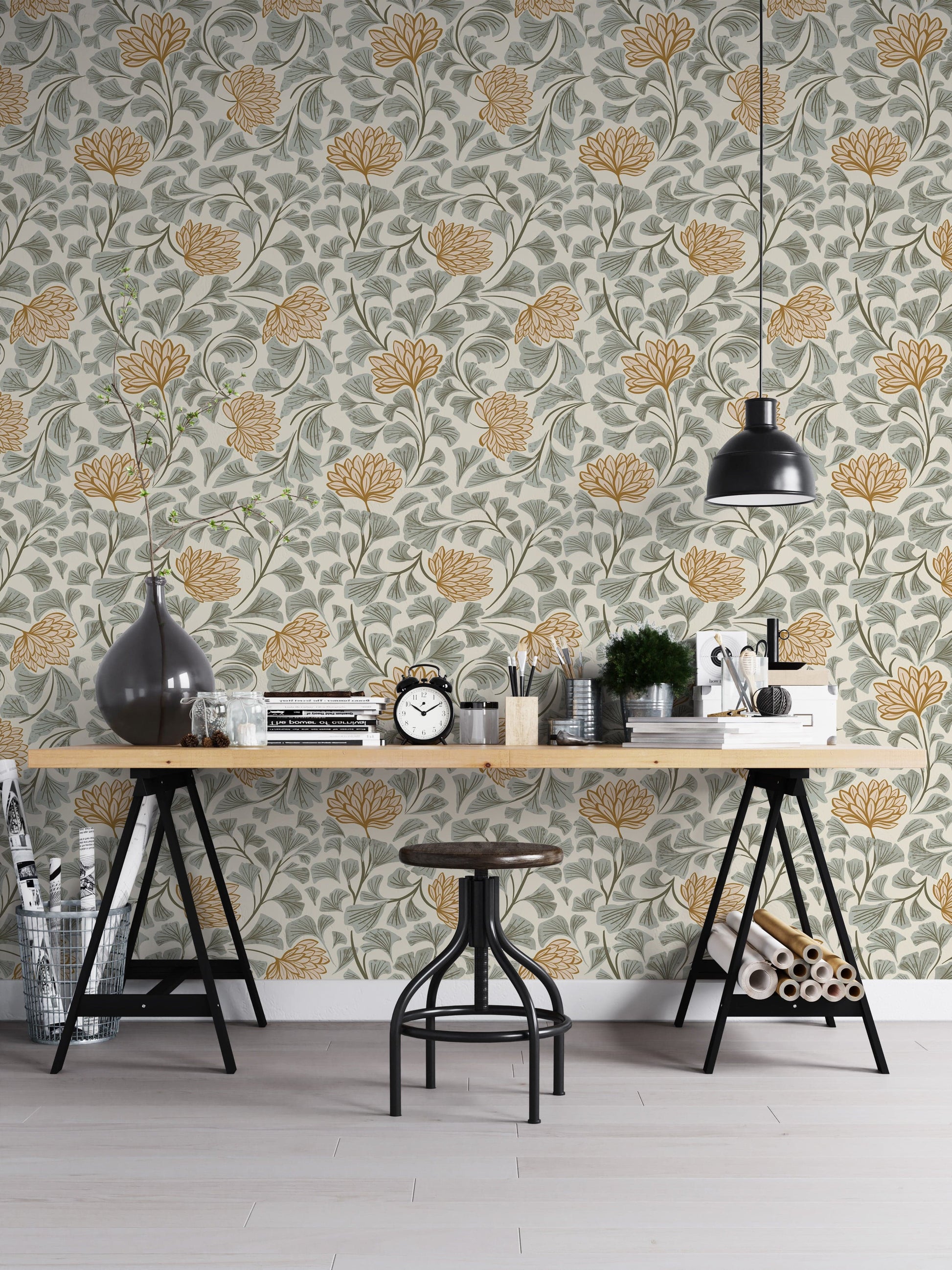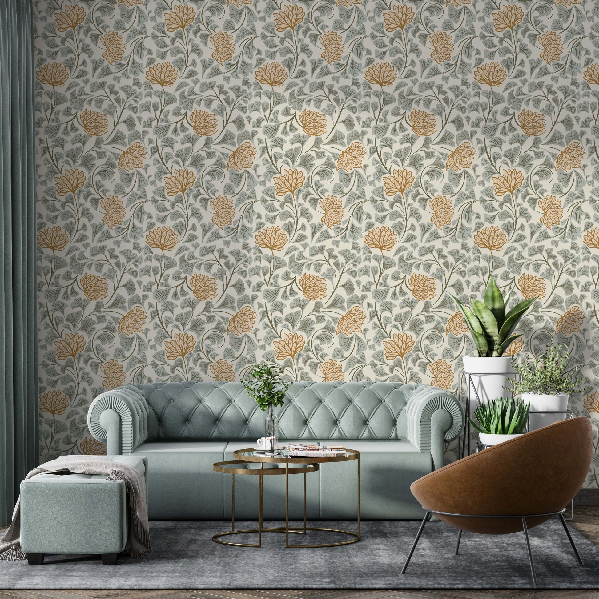 Find your inner peace with this wallpaper. Its design features a harmonious blend of delicate ginkgo leaves and softly colored blossoms in a repeating pattern. The calming palette of muted greens, warm beiges, and subtle gold accents creates a tranquil ambiance. The subtle texture adds a touch of elegance, transforming any space into a serene sanctuary. Ideal for bedrooms, meditation rooms, or spaces where relaxation is key, this wallpaper inspires a feeling of calm and tranquility.